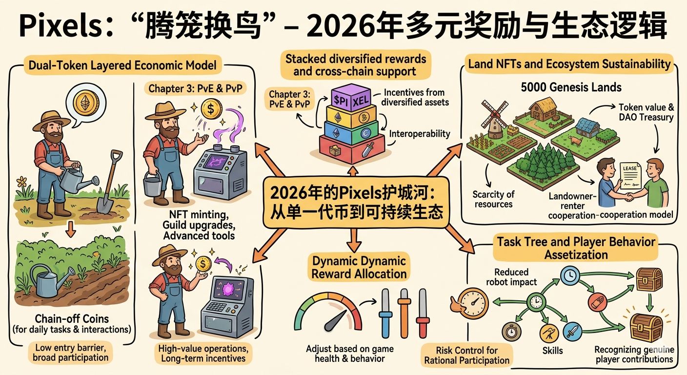 Recently, I carefully studied the underlying adjustments of Stacked. In the past, when we received tokens, we felt it was only natural to use our own currency. But now, this single-line logic seems too fragile; when the price fluctuates, players run away faster than anyone else. This time, Pixels did not stick to a single token but pushed the reward system towards a more diverse direction. What you initially receive is still $PIXEL, but this is just the starting point; later, it will gradually accommodate external assets and cross-chain incentives. On the surface, it seems like there are just a few more options, but in reality, it is dispersing the selling pressure. The time you spend in the open world of @Pixels will not yield coins that you want to dump immediately; instead, you will obtain a richer asset combination. This changes the logic of retention; you don't just grab and run, but have more reasons to stay. I think this is called 'changing the cage for birds': first, use $PIXEL to retain the most core active users, and then connect external resources through Stacked, transforming from a purely social game into a fundamental platform capable of supporting various reward logics.