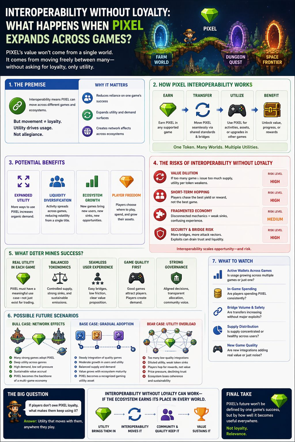 I remember the first time I looked at PIXEL and noticed how casually interoperability was mentioned. It wasn’t framed as a feature, more like an assumption. Assets moving across games, player identity persisting between environments, economies loosely connected instead of siloed. At the time, it sounded like progress. Now I’m not as sure it’s that simple.