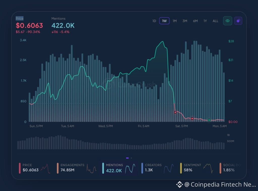 RAVE price action reflects a classic hype-driven cycle, in which a sharp surge toward the $28 level coincided with a spike in social mentions and engagement. Data from Lunar Crush shows mentions climbing above 422K, while sentiment remains relatively elevated at around 58%, even after the crash. This divergence suggests that while the price collapsed rapidly, market attention has not faded at the same pace. Such conditions typically indicate retail-driven momentum rather than strong fundamental backing, increasing the likelihood of volatile price swings.