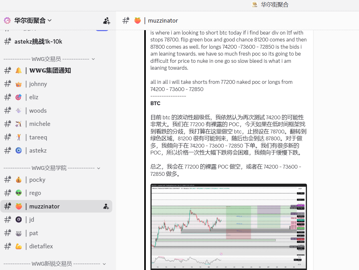 Core logic: A detailed breakdown of muzzinator's thinking. Currently, BTC is consolidating at a high level, but there is an 'exposed POC' (Point of Control) at 77200. If a divergence appears on a lower time frame, this could be an excellent ambush point for shorting.