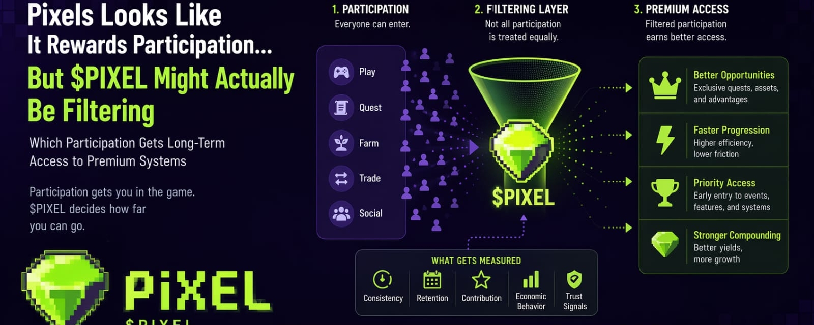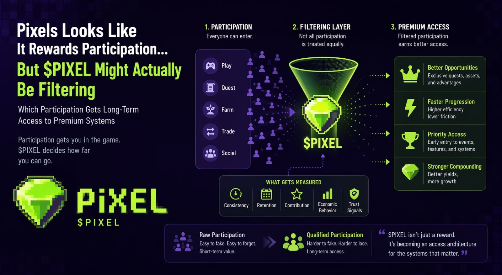 I used to think the useful signal in game economies was easy to spot. You look at wallet activity, daily users, token sinks, maybe a chart if the market is feeling generous that week. If people keep showing up and touching the system, something must be working. That was the simple version I carried for a while. But the longer I watch systems like Pixels, the less I trust raw participation as the real unit of value. A lot of people can enter a loop. That part is not hard. What matters more, I think, is what the system remembers about that participation later, and which forms of it become valid tickets into better layers of the economy.