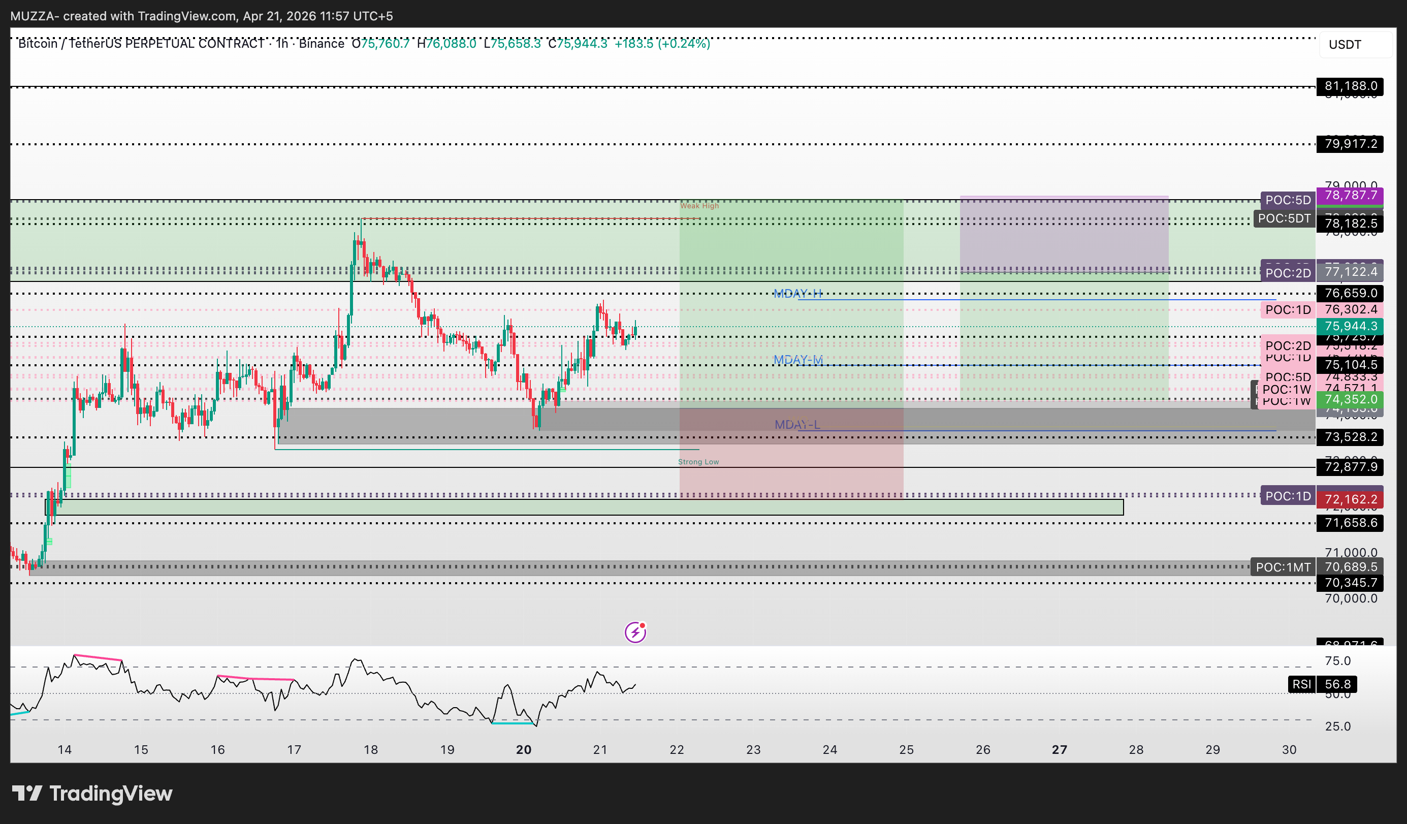 Core Logic: 1. Bearish Scenario: 77200 exposes the pressure of POC, combined with bearish divergence signals on low time frames.