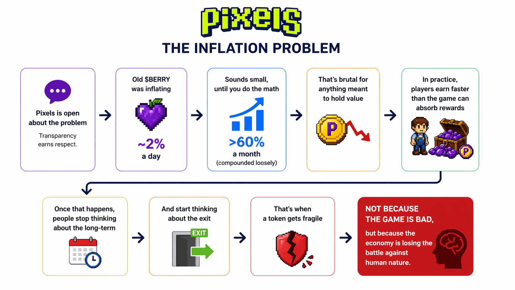 Pixels has been pretty open about this problem, which I respect. Its old $BERRY currency was reportedly inflating at around 2% a day. That sounds small until you do the math. Two percent a day is more than 60% a month if you compound it loosely, and that’s brutal for anything meant to hold value. In practice, that means players are earning faster than the game can absorb the rewards. Once that happens, people stop thinking about the long-term and start thinking about the exit. That’s when a token gets fragile. Not because the game is bad, but because the economy is losing the battle against human nature.