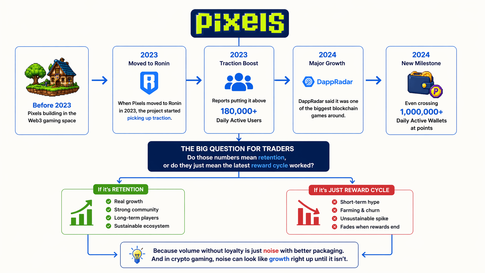 When Pixels moved to Ronin in 2023, the project started picking up traction, with reports putting it above 180,000 daily active users. Then in 2024, DappRadar said it was one of the biggest blockchain games around, even crossing 1 million daily active wallets at points. Those are big numbers, no doubt. But here’s the part traders pay attention to: do those numbers mean retention, or do they just mean the latest reward cycle worked? Because volume without loyalty is just noise with better packaging. And in crypto gaming, noise can look like growth right up until it isn’t.