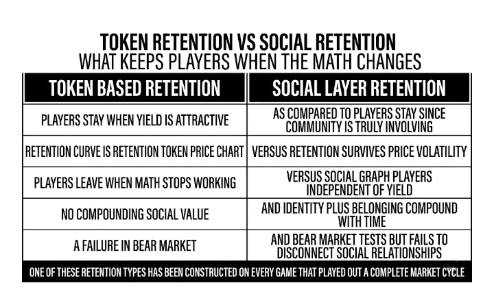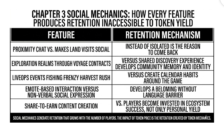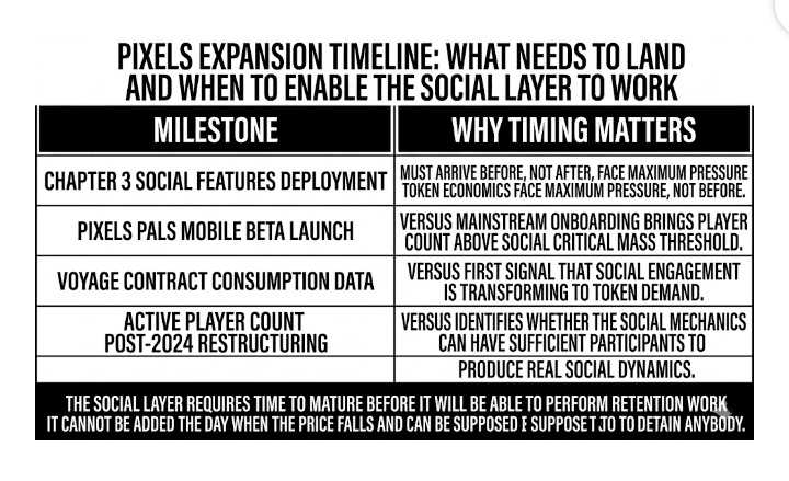 What they do right: the correct sequencing and uncommon is the deciSion to construct social mechanics and then require the token. Social features are usually an addition to most projects to provide a retention patch when token economics begin to exhibit signs of stress. The pixels are developing proximity chat, shared activities, and exploration web at a time when the protocol remains below RORS breakeven. The implication of that sequencing is that the team recognizes that the social gravity can not do any retention work until it develops. You cannot pour a social layer on the day the token price falls and hope that it will hold anybody. You must construct it when no one is looking and get it ready when the time arrives.