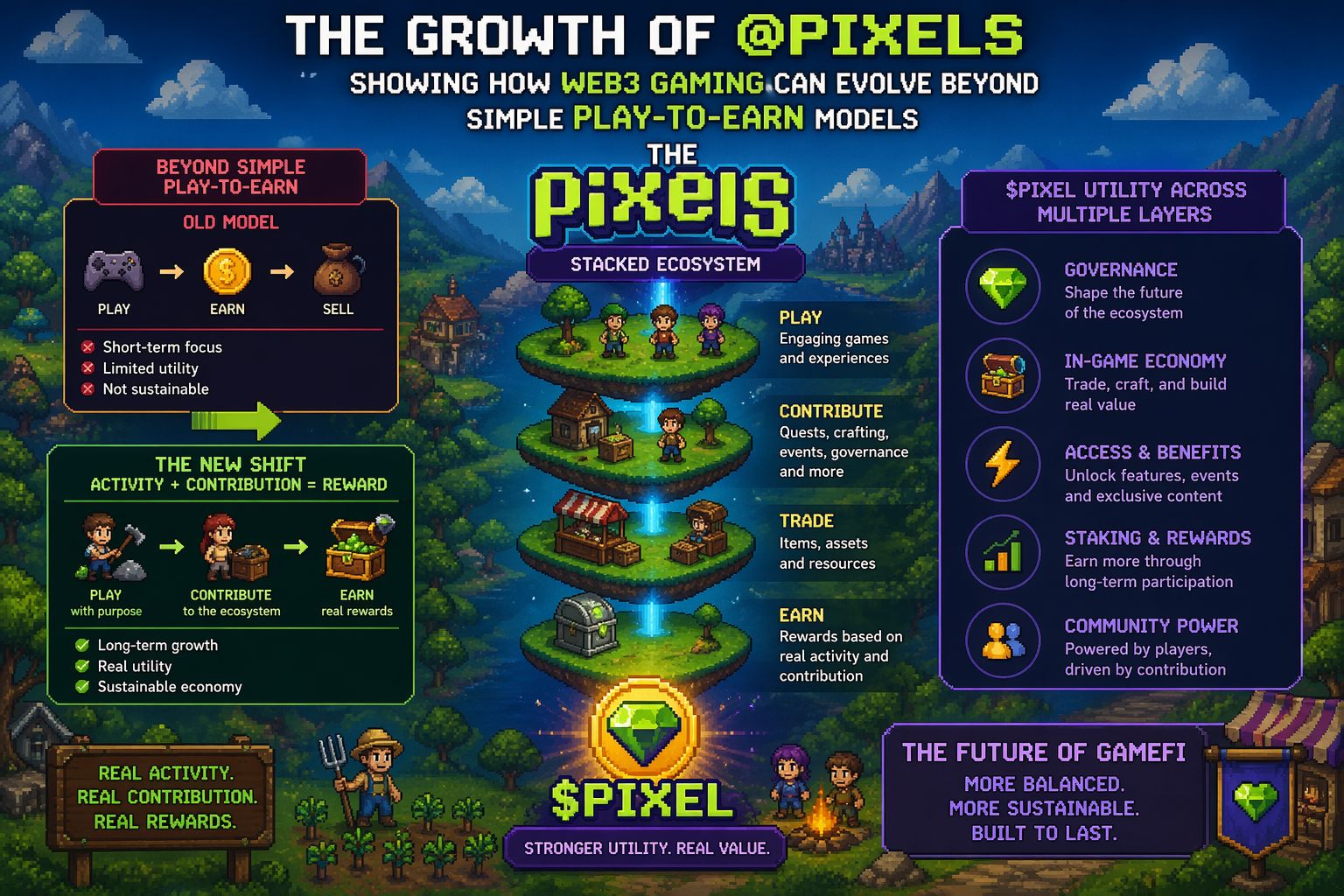 $PIXEL The growth of @Pixels is a strong signal that Web3 gaming is finally maturing beyond the limitations of simple play-to-earn mechanics. Instead of focusing purely on extraction, the Stacked ecosystem introduces a more balanced and sustainable model where players are rewarded based on real activity, meaningful participation, and contribution to the in-game world.