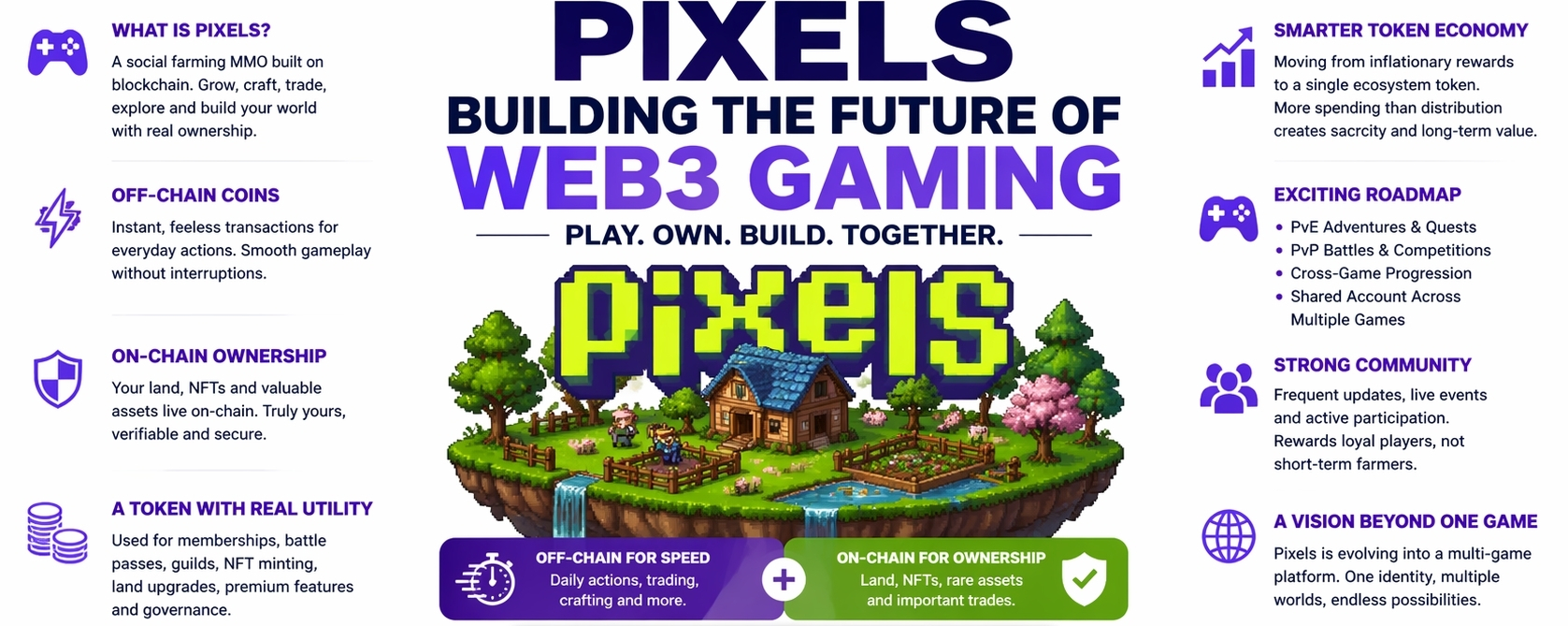 Pixels is not stopping at one game. It is expanding into a broader ecosystem. Upcoming features include PvE content with missions and deeper gameplay loops, PvP systems that introduce competition and skill-based rewards, cross-game progression where your identity and achievements carry across multiple titles, and a shared account system that connects everything into one seamless experience. The vision is clear: one identity, multiple worlds, and a connected gaming universe.