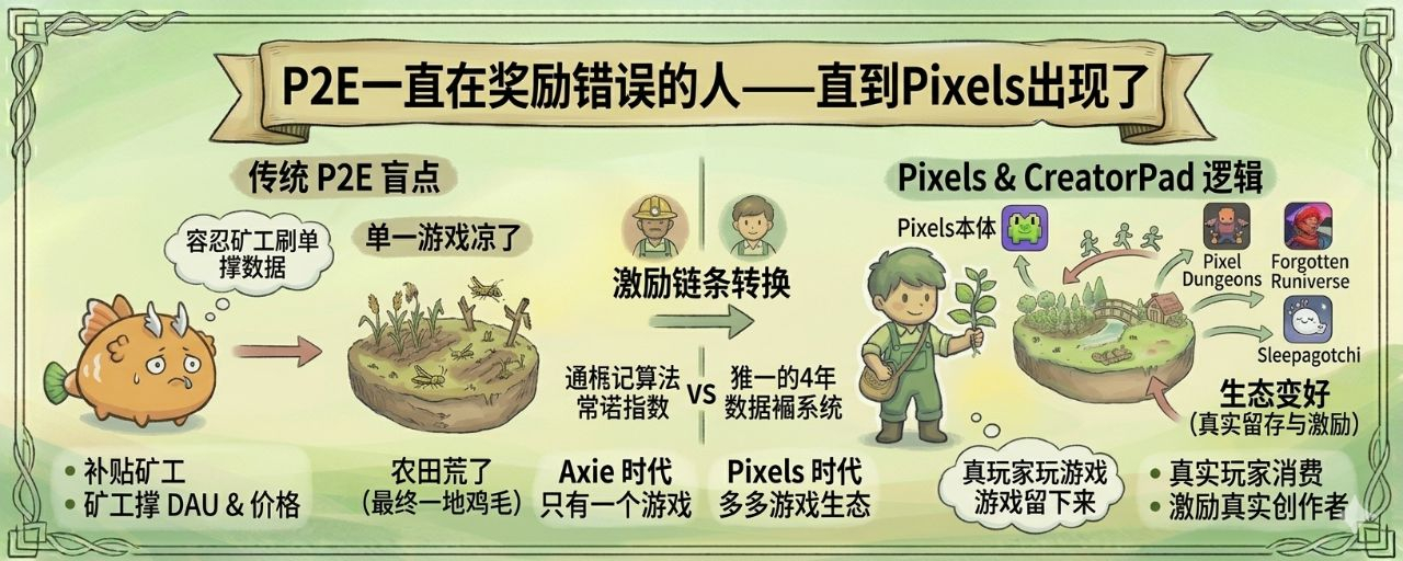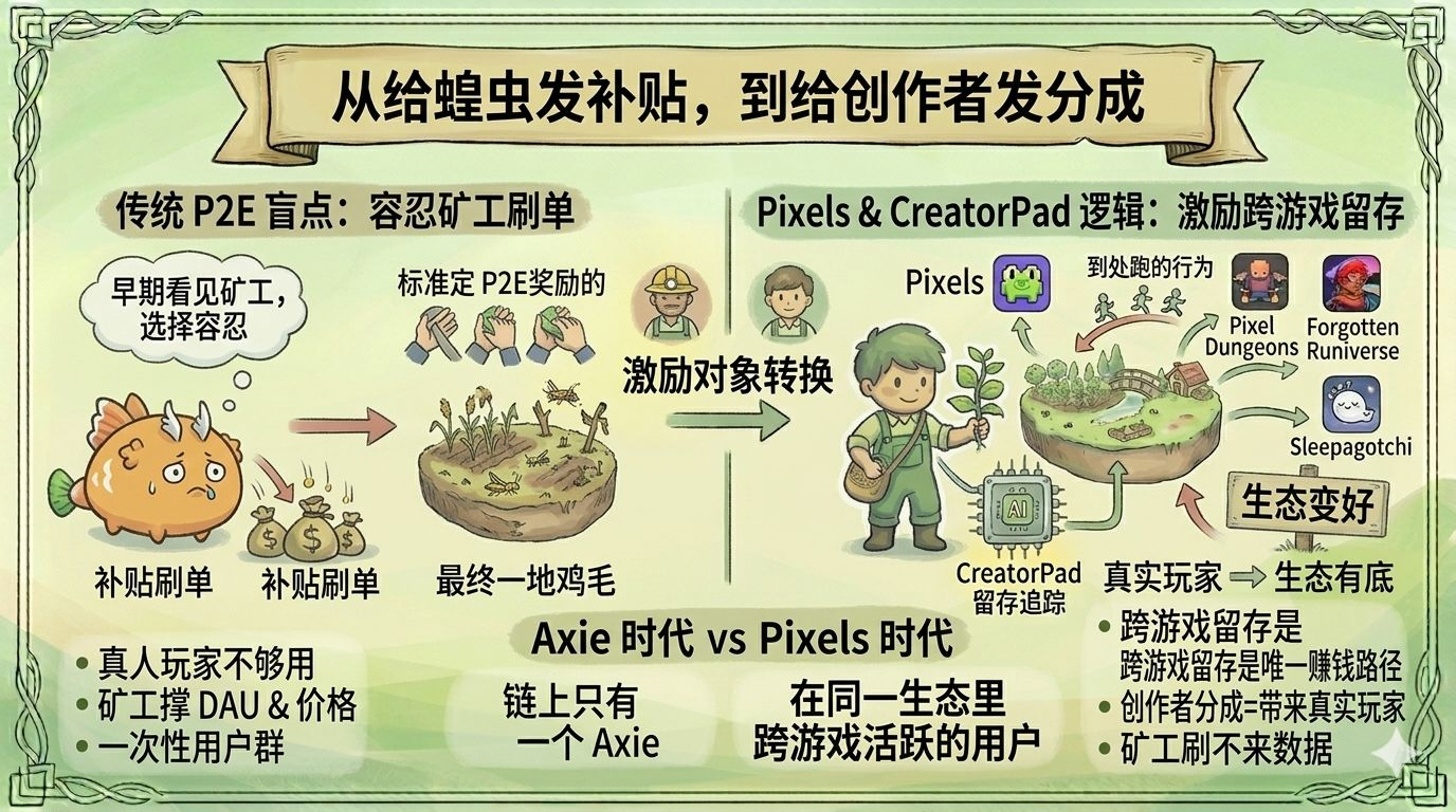 P2E giving rewards to miners is like giving subsidies to locusts to ensure a bountiful harvest. The numbers look good in the short term, but in the long term, the fields become barren. CreatorPad changed the incentive targets from miners to creators, and only then did the chain run completely for the first time.