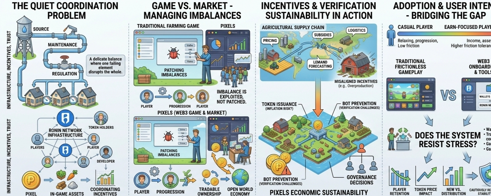 My own view, after thinking this through, is cautiously measured. Pixels has some of the right instincts in focusing on accessible gameplay and social interaction rather than purely financial mechanics. That gives it a stronger foundation than many earlier attempts in this space. But the presence of a tokenized economy introduces pressures that are hard to ignore. The real test isn’t whether it can attract attention or early engagement—it’s whether it can sustain a balanced, resilient system when conditions are less favorable.
