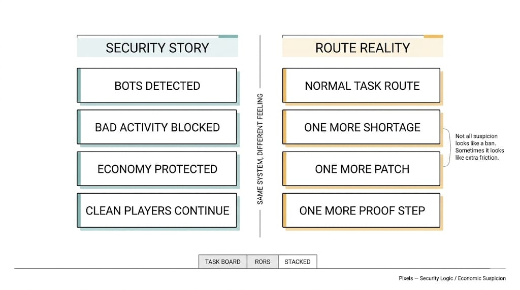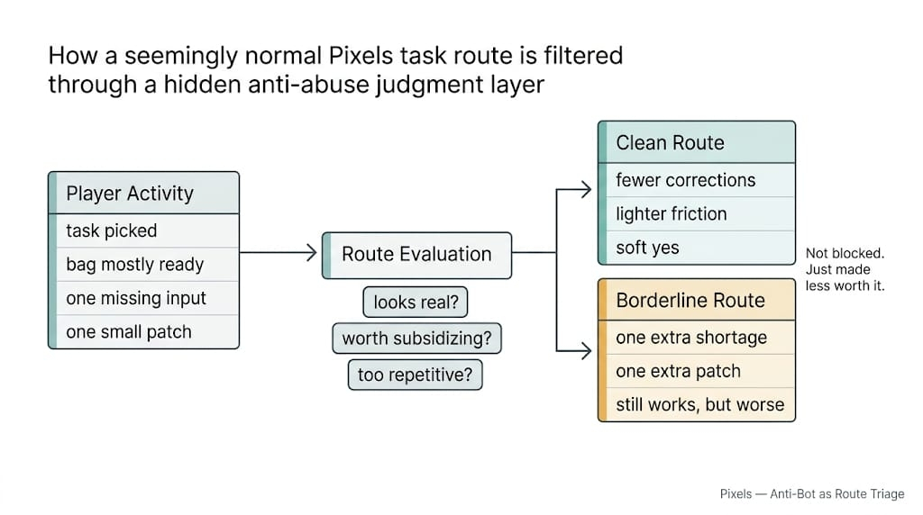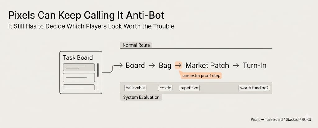 And on Pixels it matters because the reward layer is not innocent anymore. The game already knows what getting farmed looks like. That’s half the reason Stacked exists. Half the reason the Task Board doesn’t just spray value around and hope nobody industrializes the soft spots. Half the reason anti-abuse logic has to live so close to the actual route. Once that happens, the anti-bot layer is no longer just refusing obvious garbage. It is constantly sorting the gray area between believable player activity and expensive nonsense.