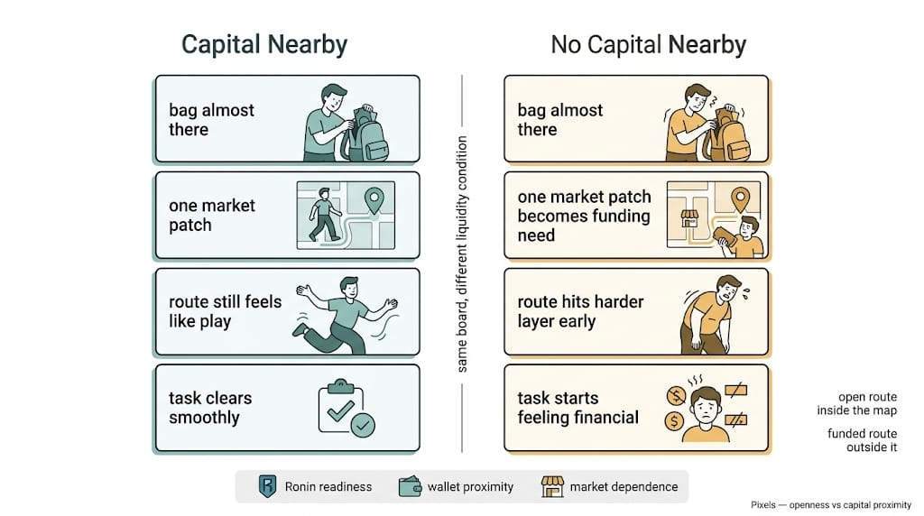 Because the weaker player feels that line immediately. Weak Speck night. Thin wallet. No nice little cushion sitting ready on Ronin. The route hits the membrane early and turns ugly fast. A better-capitalized player lives in a much softer version of the same game. One patch stays small. One market correction stays casual on Pixels. One route still looks like “play” because the funding layer was already solved before the session started.