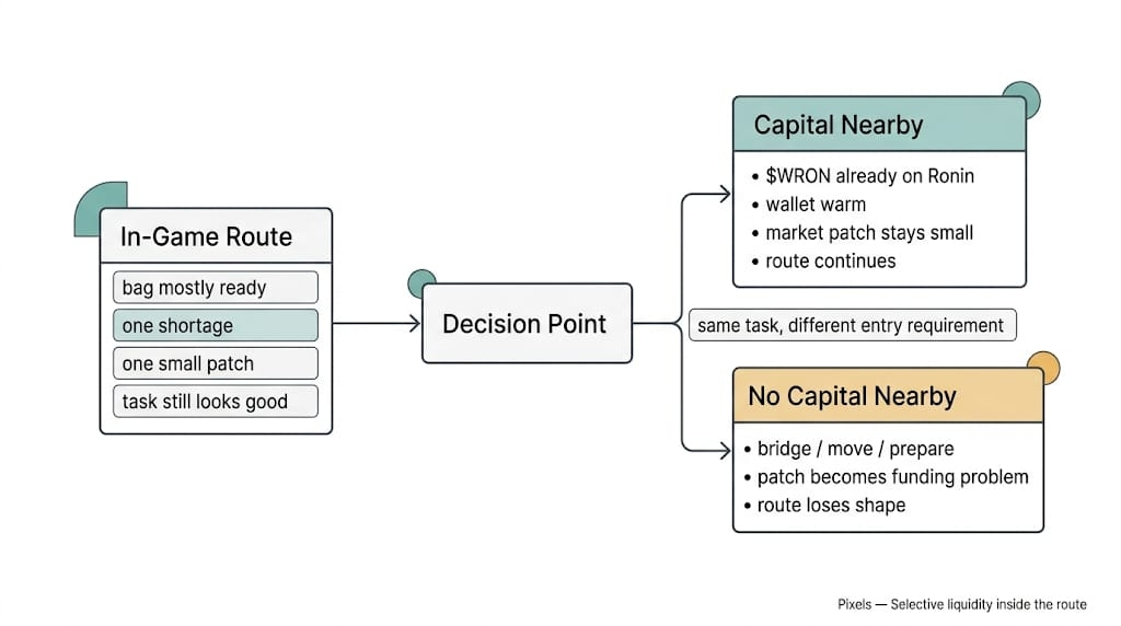 I had one late moment that made it worse. Pixels' task Board refreshed again. Another route. Same smell. Mostly there. One patch away. I already knew I could make it work because the wallet was already positioned for it. And that was exactly why the task stopped feeling like an in-game opportunity and started feeling like a soft demand on liquidity I had prepared somewhere else.