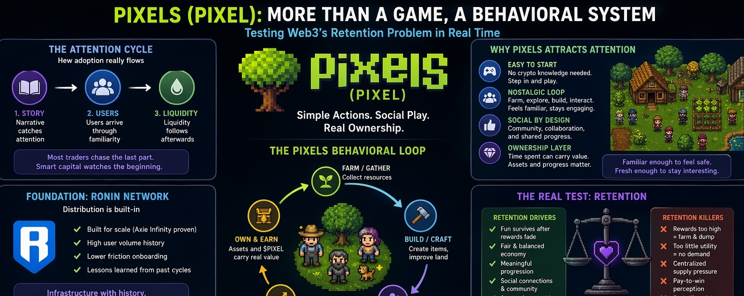 Pixels runs on Ronin Network, which already tells me distribution is not an afterthought. This chain has seen real user volume before through Axie Infinity. And that history matters, because it comes with lessons. Growth is easy when rewards are flowing. Sustainability is where most things break.