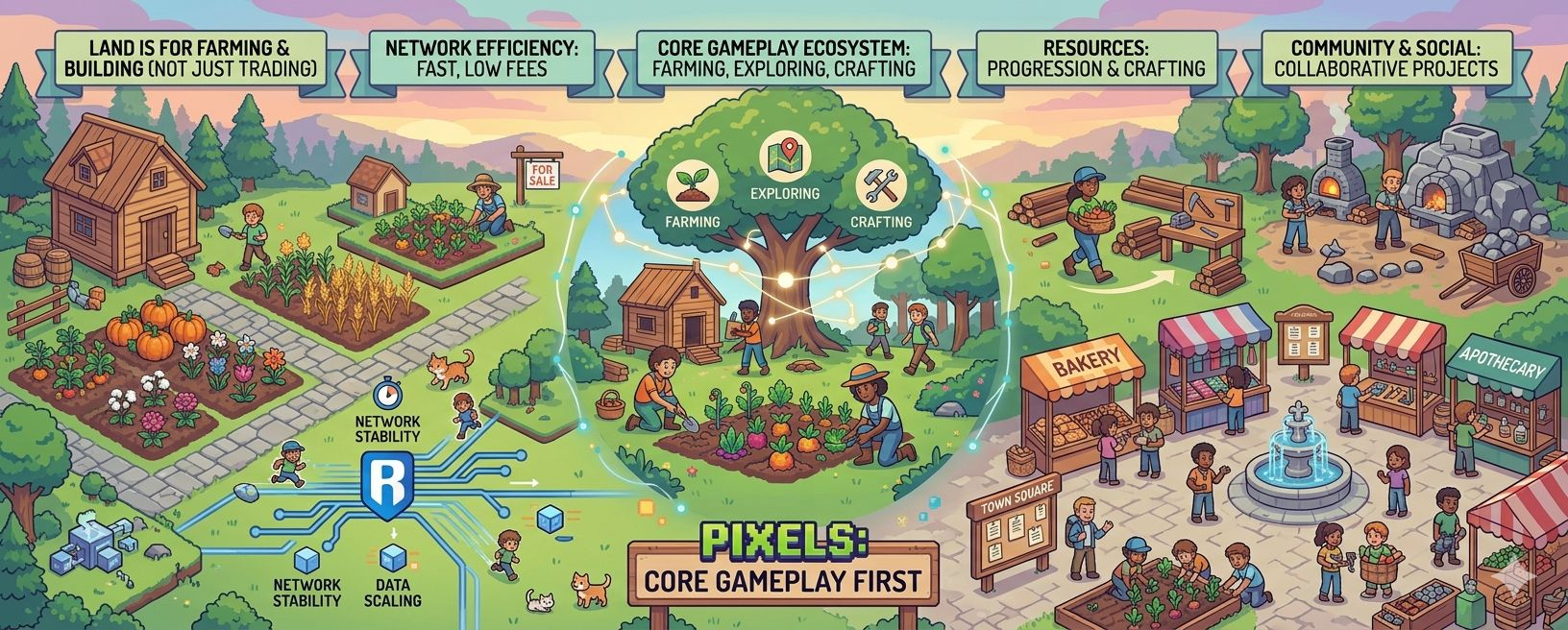 The game is built on the Ronin Network, which is made for gaming. It makes transactions fast and cheap so they do not interrupt the game. This is important because slow and expensive transactions can make the game less fun. Pixels hides most of the blockchain stuff so players can just play the game.