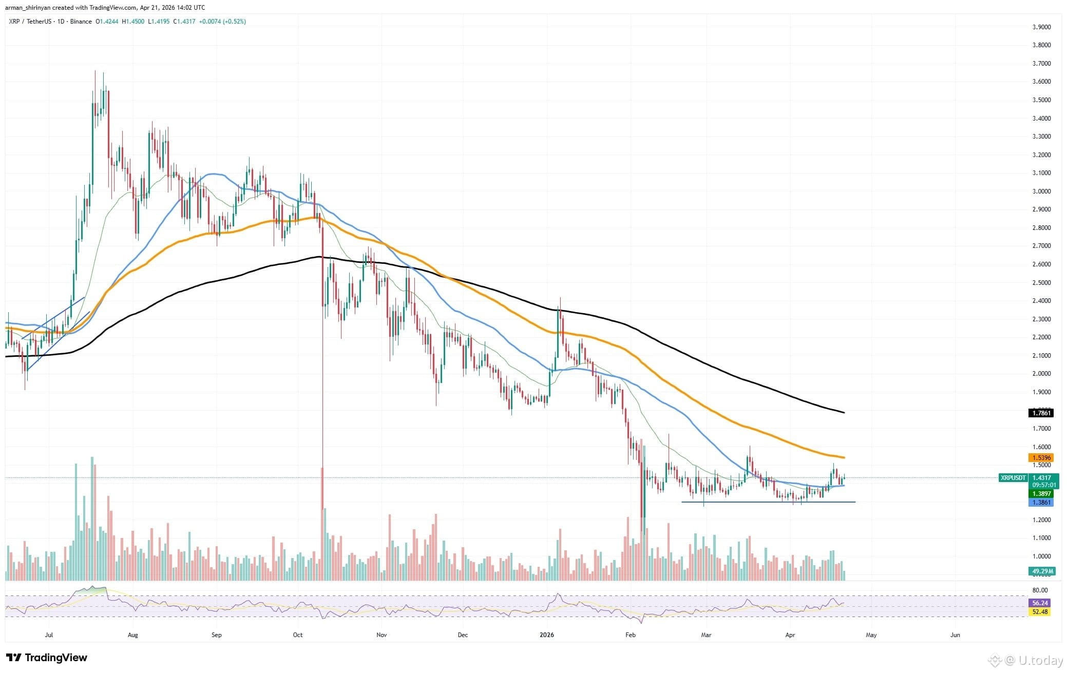 XRP is stabilizing for once, but the longer-term outlook is for sure unstable. The price is holding above a newly formed support zone near $1.38 and is currently trading in the mid-$1.40 range. Although this base has been tested several times, indicating that buyers are regularly stepping in, the strength of that demand is still debatable.
