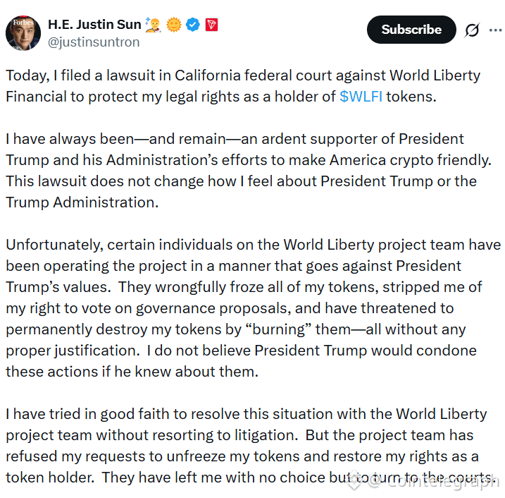 “I have tried in good faith to resolve this situation with the World Liberty project team without resorting to litigation. But the project team has refused my requests to unfreeze my tokens and restore my rights as a token holder. They have left me with no choice but to turn to the courts,” he added.