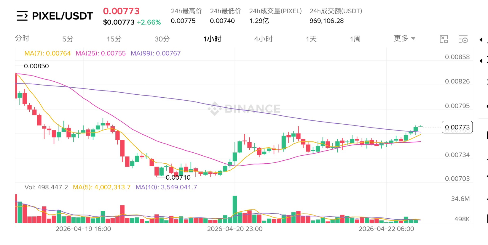 $PIXEL Currently priced at $0.00773, with a 24-hour increase of +2.66%, a 24h high of $0.00775, a low of $0.00740, a trading volume of 129 million PIXEL, and a transaction amount of 969,000 USDT, the trading volume has severely shrunk. The MA7 is at 0.00764, crossing above the MA25 at 0.00755, but the MA99 is pressing down from 0.00767, with the three lines beginning to intertwine, and the direction is unclear. A small increase without volume indicates a turnover rather than a trend; I will not take it as any signal. Real-life research prioritizes survival; today’s K-line has no impact on my judgment of the long-term logic of $PIXEL. Whether Core Pixels Mobile can truly land in 2026 is the core reason for my continued attention; the price will speak for itself, and I cannot control it.