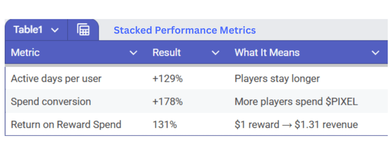 These numbers come from Pixels' own games. The real test will be when external studios adopt Stacked.
