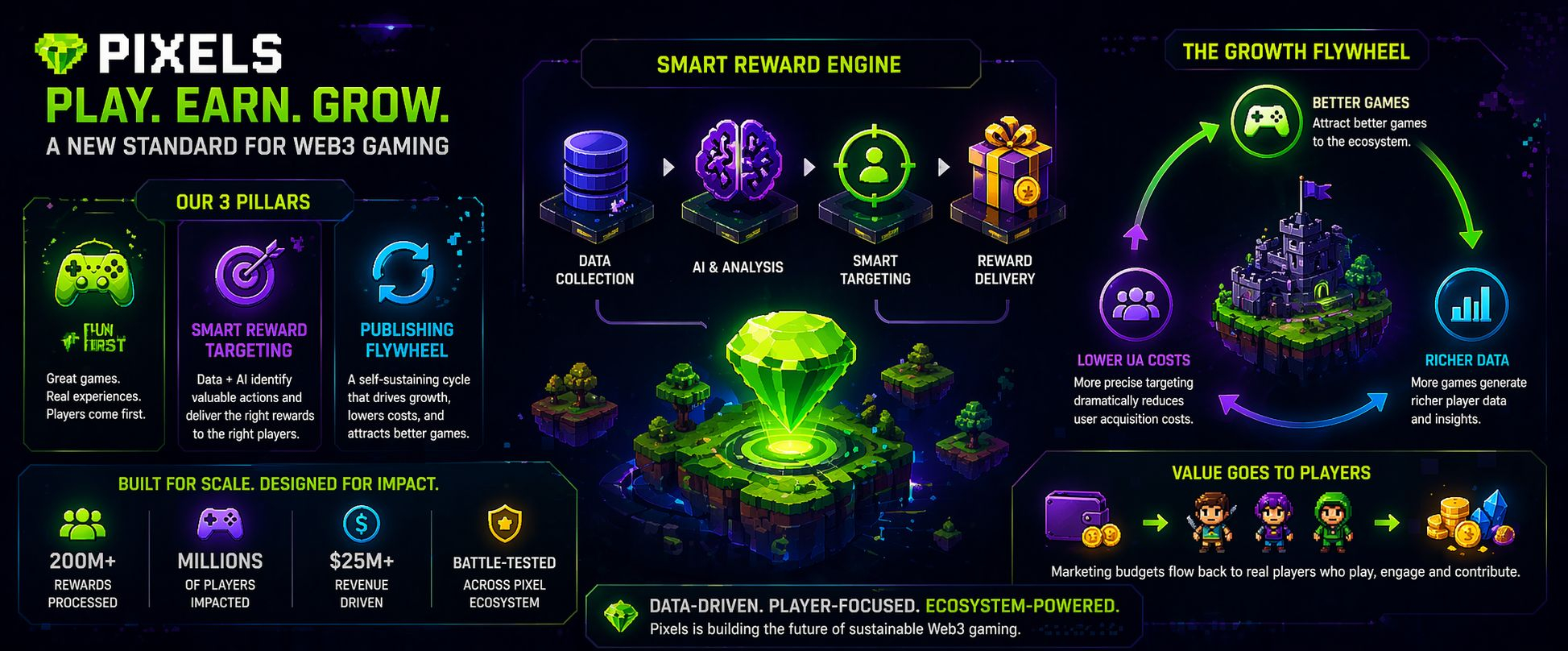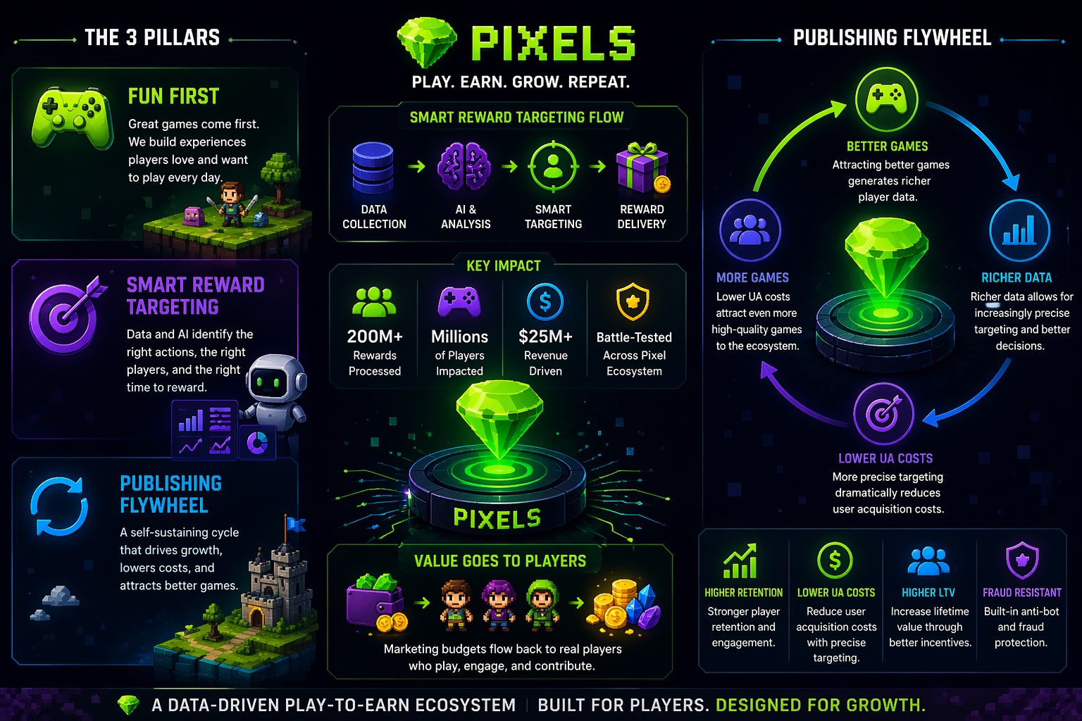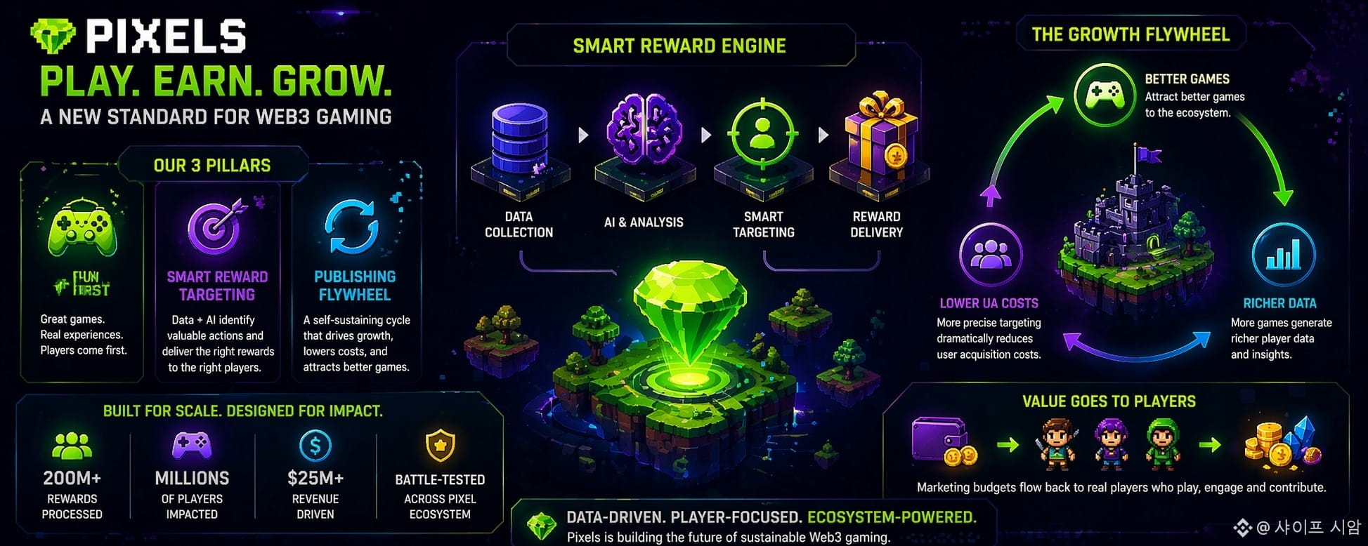 The structural advantage of this approach becomes more apparent when examining the growth mechanism embedded within the ecosystem. Pixels operates through a continuous feedback loop often described as a flywheel. As higher-quality games join the platform, they generate richer datasets. These datasets enhance targeting accuracy, allowing for more efficient reward distribution. Improved efficiency reduces acquisition costs, making the platform more attractive to additional developers. Each cycle strengthens the next, creating a compounding effect that accelerates ecosystem expansion without relying on unsustainable spending.