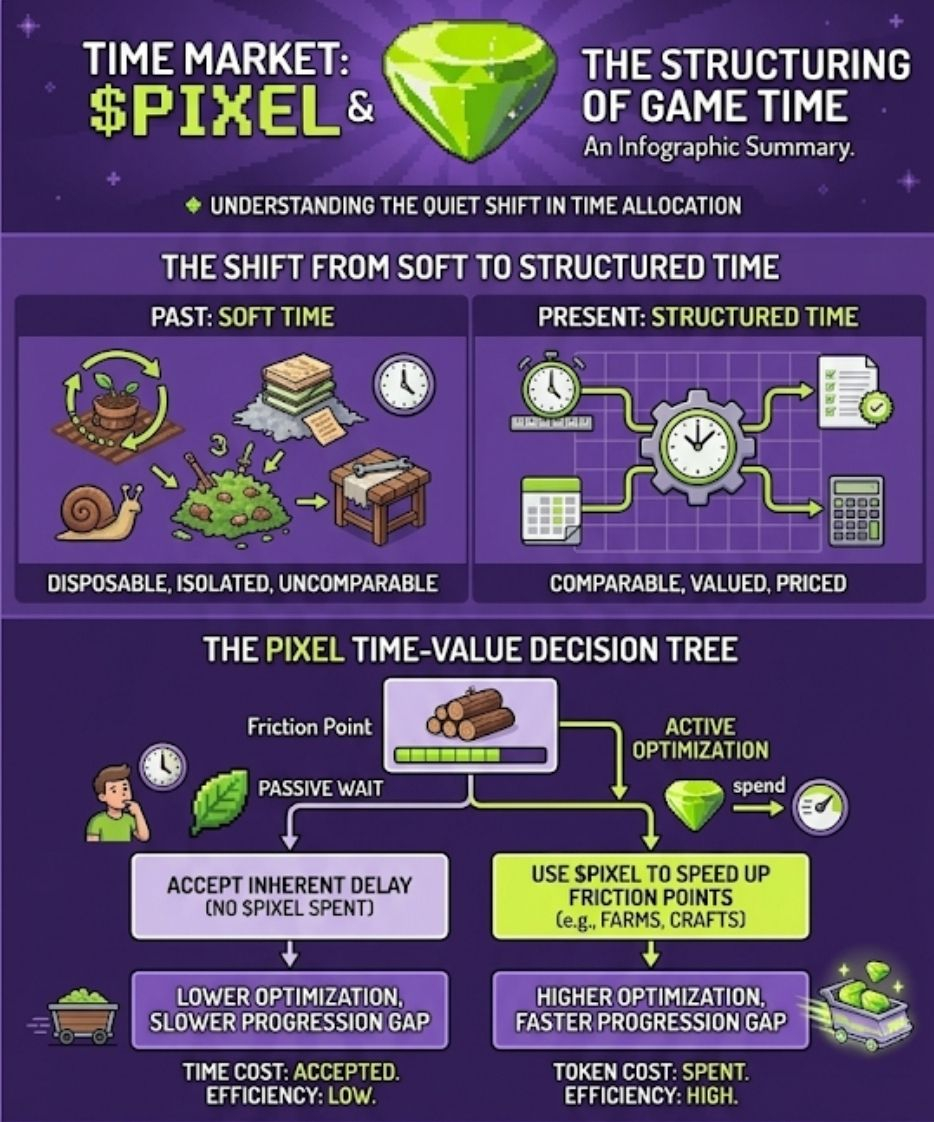 Pixels seems to be trying to address that issue, but not directly. It doesn't say, 'This is a time market.' It just builds enough structure for time to start functioning like a real-time marketplace.