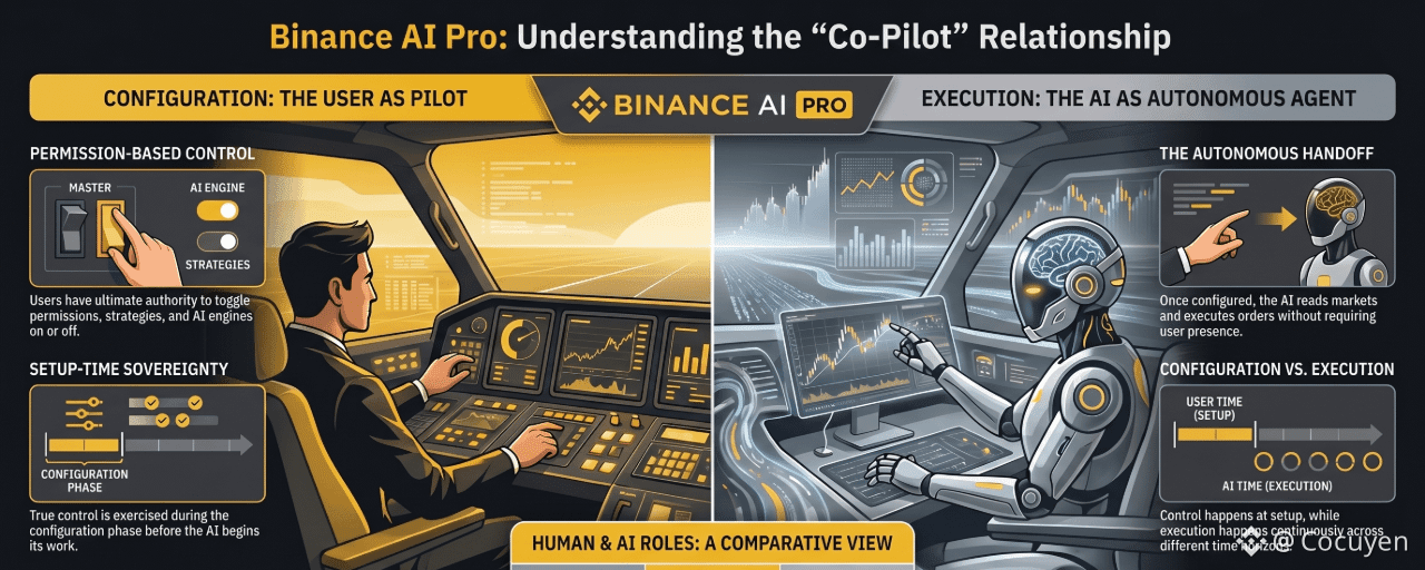 Because there is a pattern in how automated systems describe user control that the field accepts without considering what real control means once the execution process begins. The presentation describes Binance AI Pro as a co-pilot assistant. Users have ultimate control over the permissions that the AI holds. They can toggle permissions on or off at any time. The presentation is clear, and the intention is sincere.