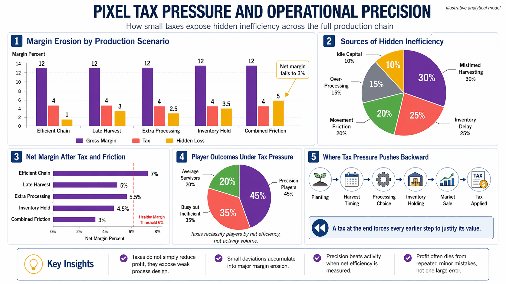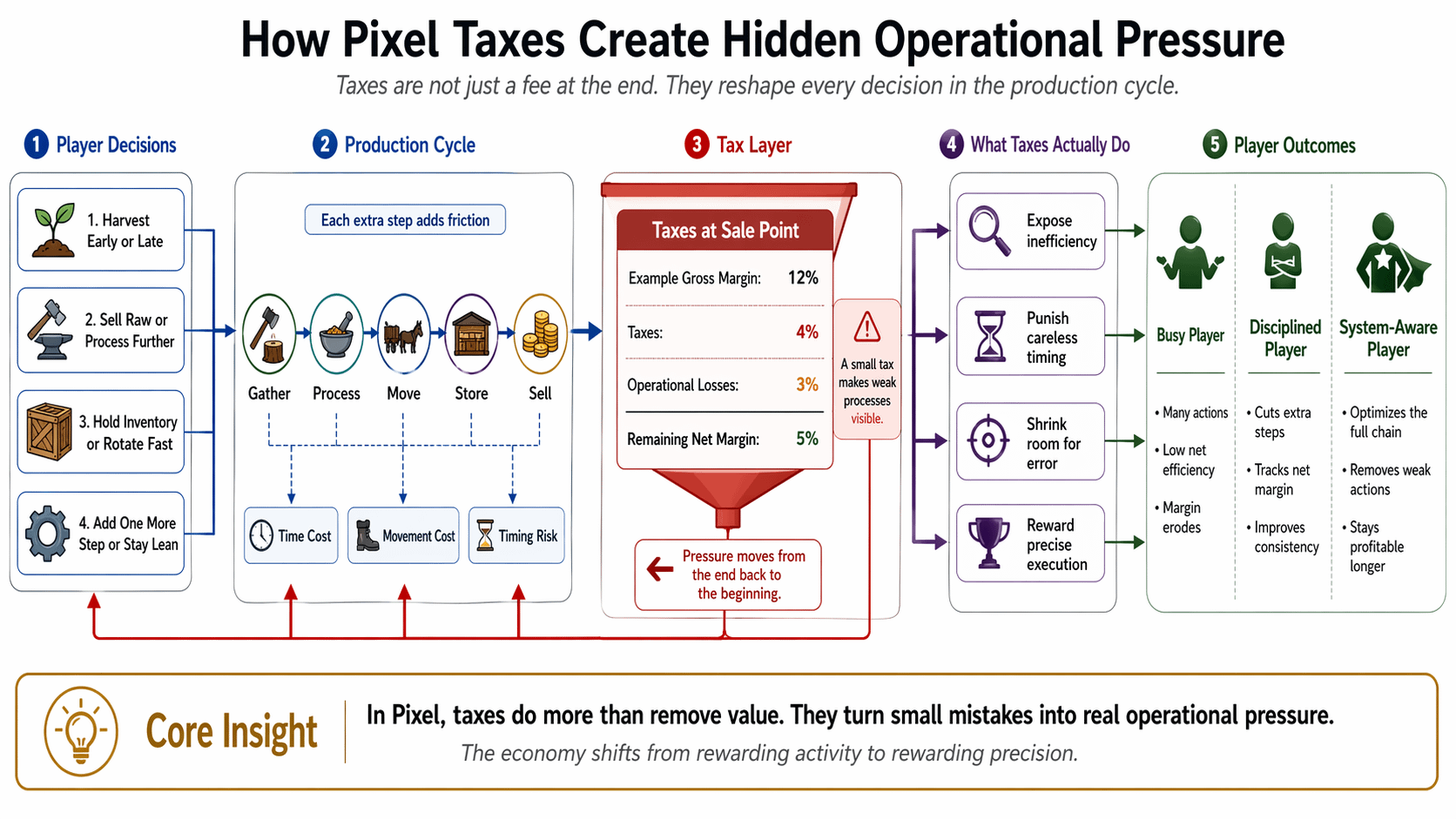The deepest part of Pixel is here. It does not use taxes to make players visibly poorer. It uses taxes to make inefficiency more expensive. Suppose one production cycle gives a gross margin of 12 percent. If taxes take 4 percent, and another 3 percent disappears through waiting, movement, and mistimed harvesting, the remaining margin is almost no longer enough to support a bloated process. At that point, the question is no longer whether the goods can be sold, but whether that process still deserves to exist.