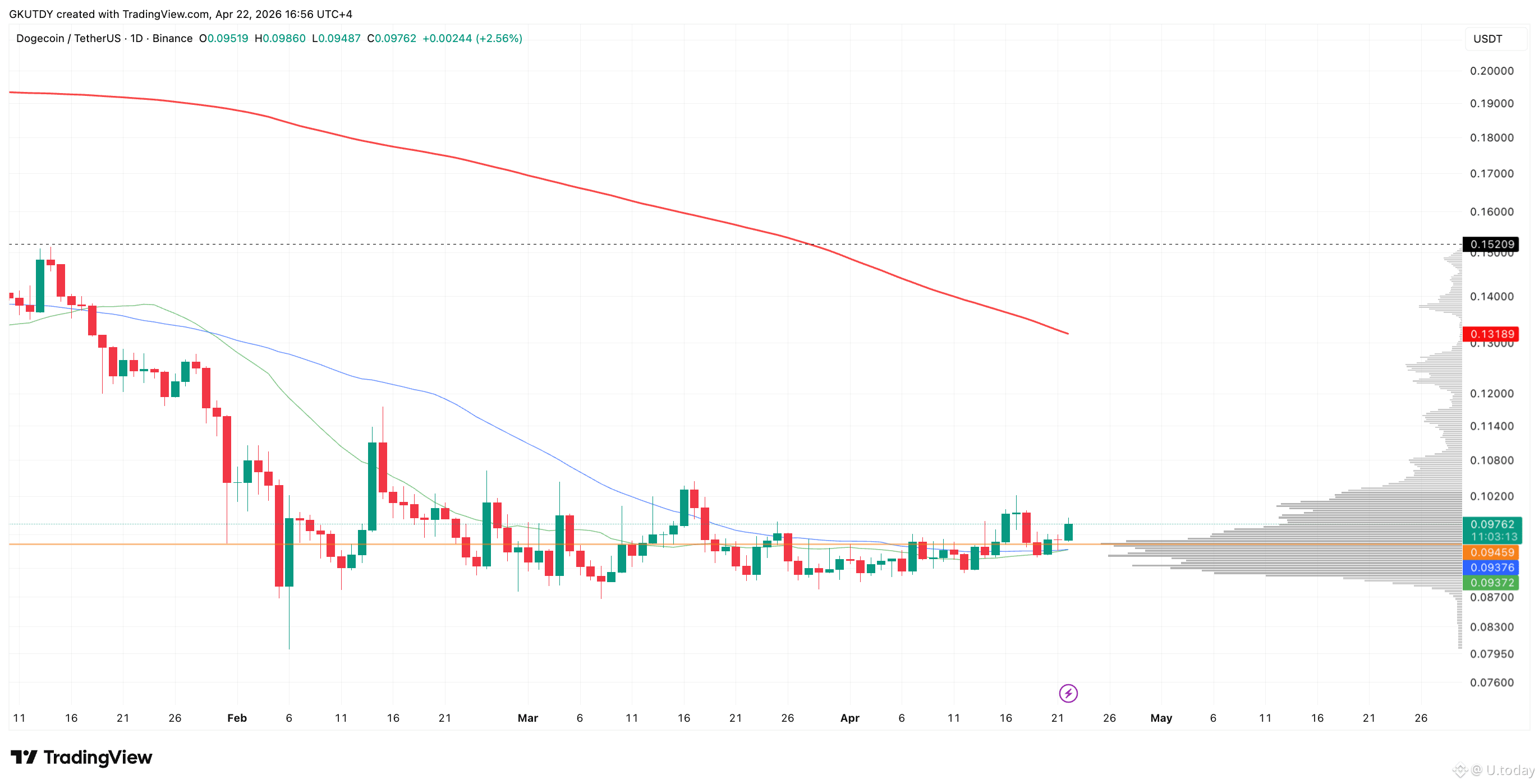 On the charts, DOGE has printed a "golden cross" for the first time in a long period, signaling the end of the extended correction from late 2025. The main price magnet is now the 200-day moving average at $0.132. From current levels near $0.098, the asset would need to gain about 34%.