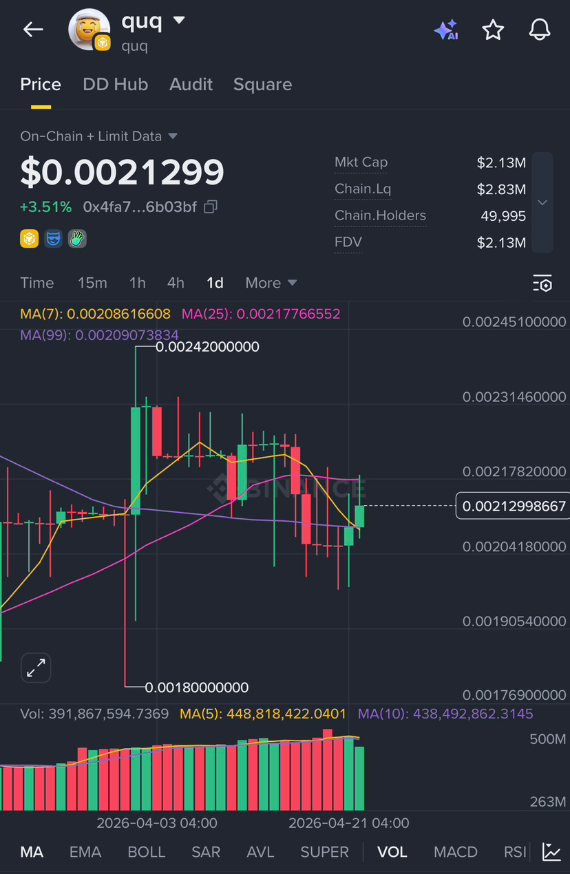 The $quq token is currently trading around $0.0021299, reflecting a modest gain of +3.51% on the daily timeframe. After experiencing a sharp spike followed by a noticeable pullback, the price action is now attempting to stabilize. The chart indicates that QUQ recently touched a local high near $0.00242 before facing resistance and retracing toward the $0.0020 support zone. This movement suggests a typical consolidation phase after a strong upward impulse. The presence of multiple moving averages (MA7, MA25, and MA99) shows that the price is hovering near a key decision area. Short-term momentum appears to be recovering as the price attempts to break above the MA25 line, which could act as immediate resistance. Meanwhile, the MA99 continues to serve as a dynamic support level, helping to prevent further downside.