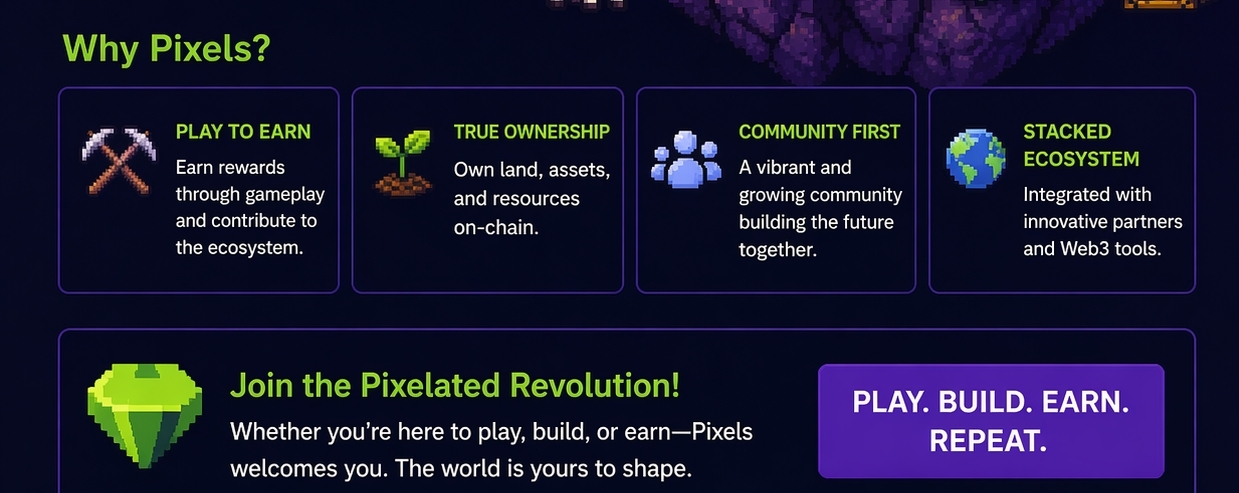 As the demand for Play-to-Earn models grows, Pixels stands out as a promising platform that combines fun, ownership, and financial opportunity. Whether you're a gamer or a crypto enthusiast, Pixels offers a unique chance to be part of the future of decentralized gaming.