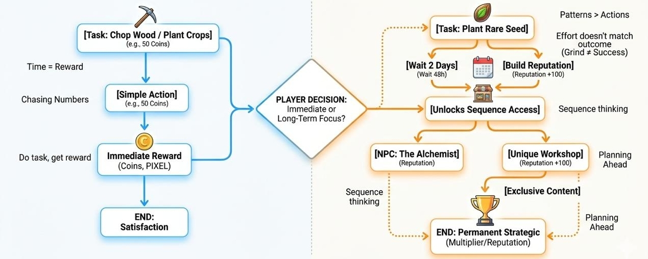 I think the game slowly pushes you to stop thinking in straight trades like “time = reward” and start thinking in sequences. Like what this action unlocks next, not just what it gives now.