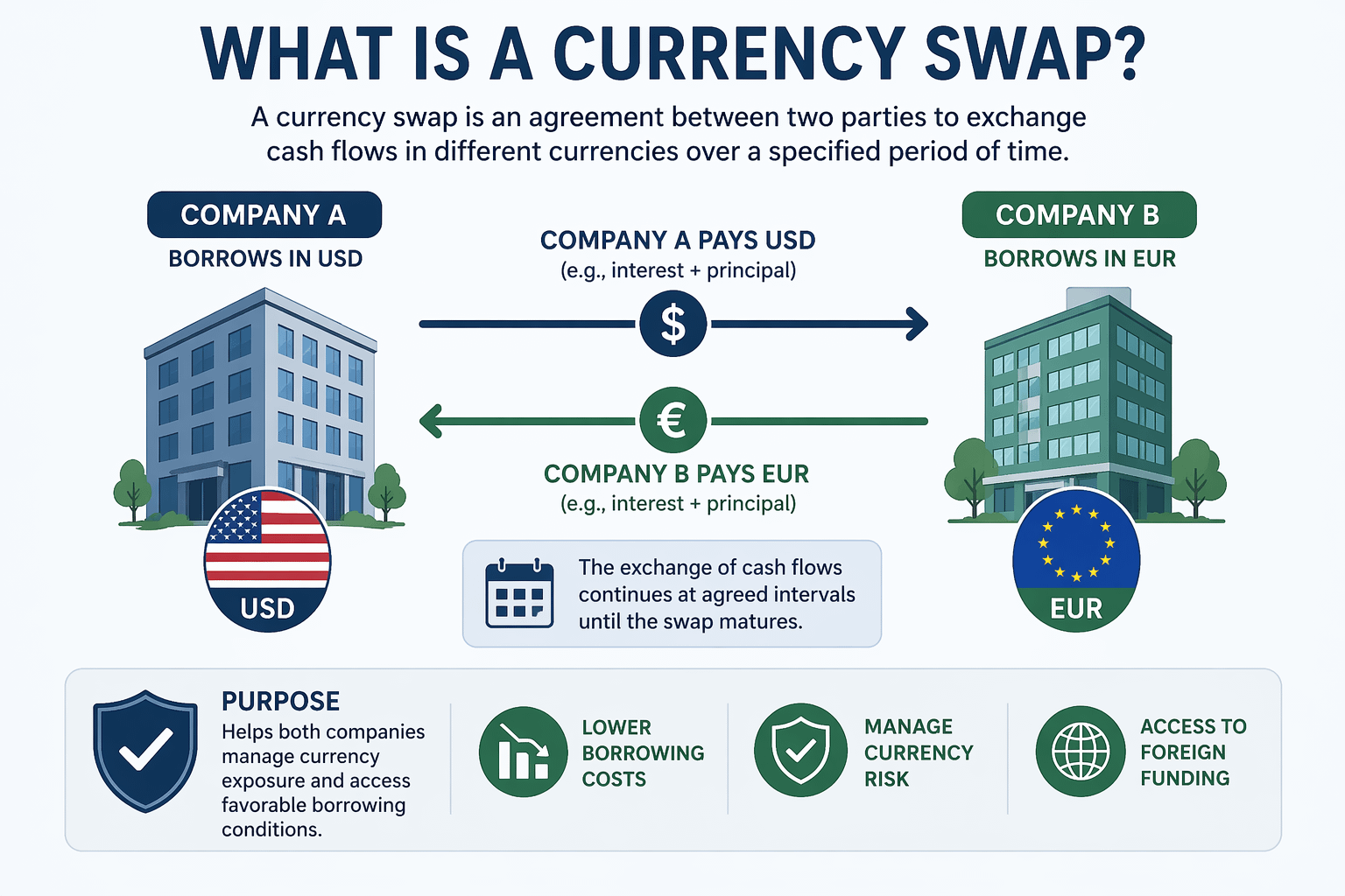 Instead of both going to banks and paying high forex fees, they cut a deal. The US firm borrows dollars cheaply at home. The German firm borrows euros cheaply at home. Then they swap.