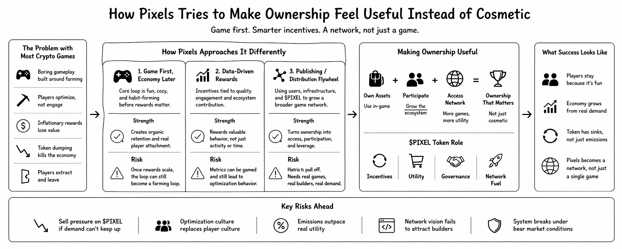 If players start treating every system like an extraction surface, then even the best-designed incentives can become fuel for the same cycle. If the token ends up under constant pressure, then the whole ownership thesis gets weaker. If the network vision does not materialize, then Pixels risks being remembered as a well-packaged attempt to improve the model without fully escaping it.