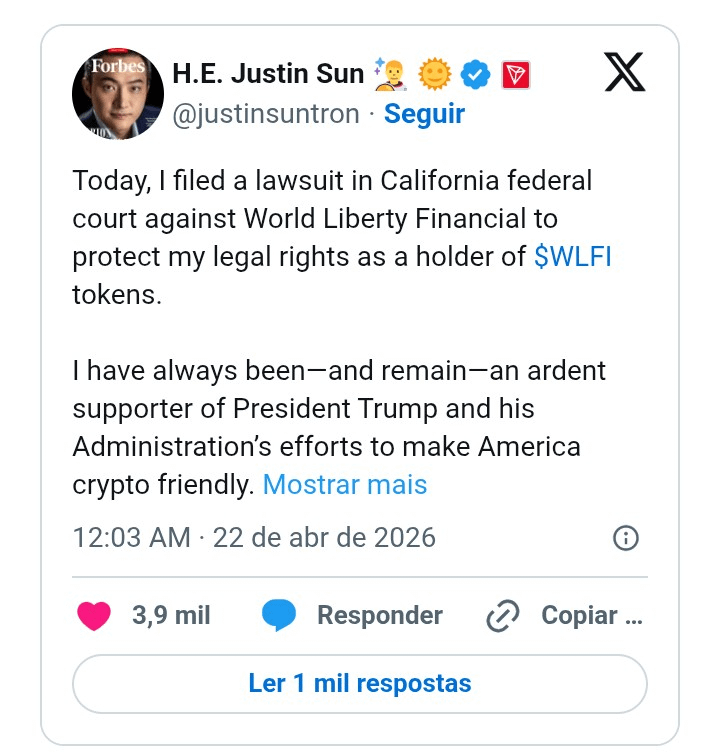 The founder of Tron filed a lawsuit on Tuesday in California against World Liberty Financial. He stated that the company froze his tokens, stripped him of his voting rights, and threatened to completely destroy his assets—all without proper warning, reason, or opportunity to appeal.
