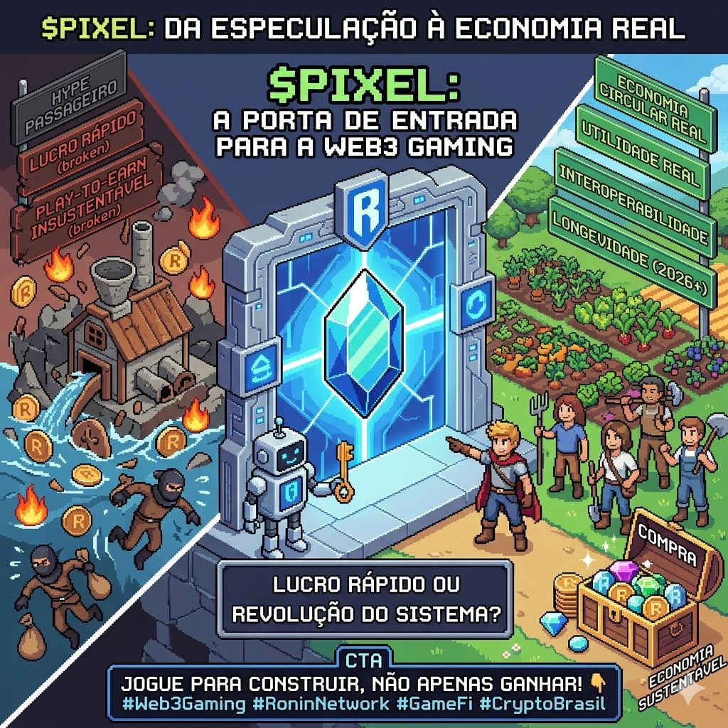 To the right, we finally find the ideal: the "Real Utility World", a thriving circular economy. Here, "Real Players" engage with "Retention and Creation", fueling the "Sustainable Ronin Economy". The value isn’t extracted and sold off immediately; it’s reinvested into the "BUY / REAL UTILITY" vault through a massive green pixel gem, symbolizing the intrinsic utility of the token for game progression.