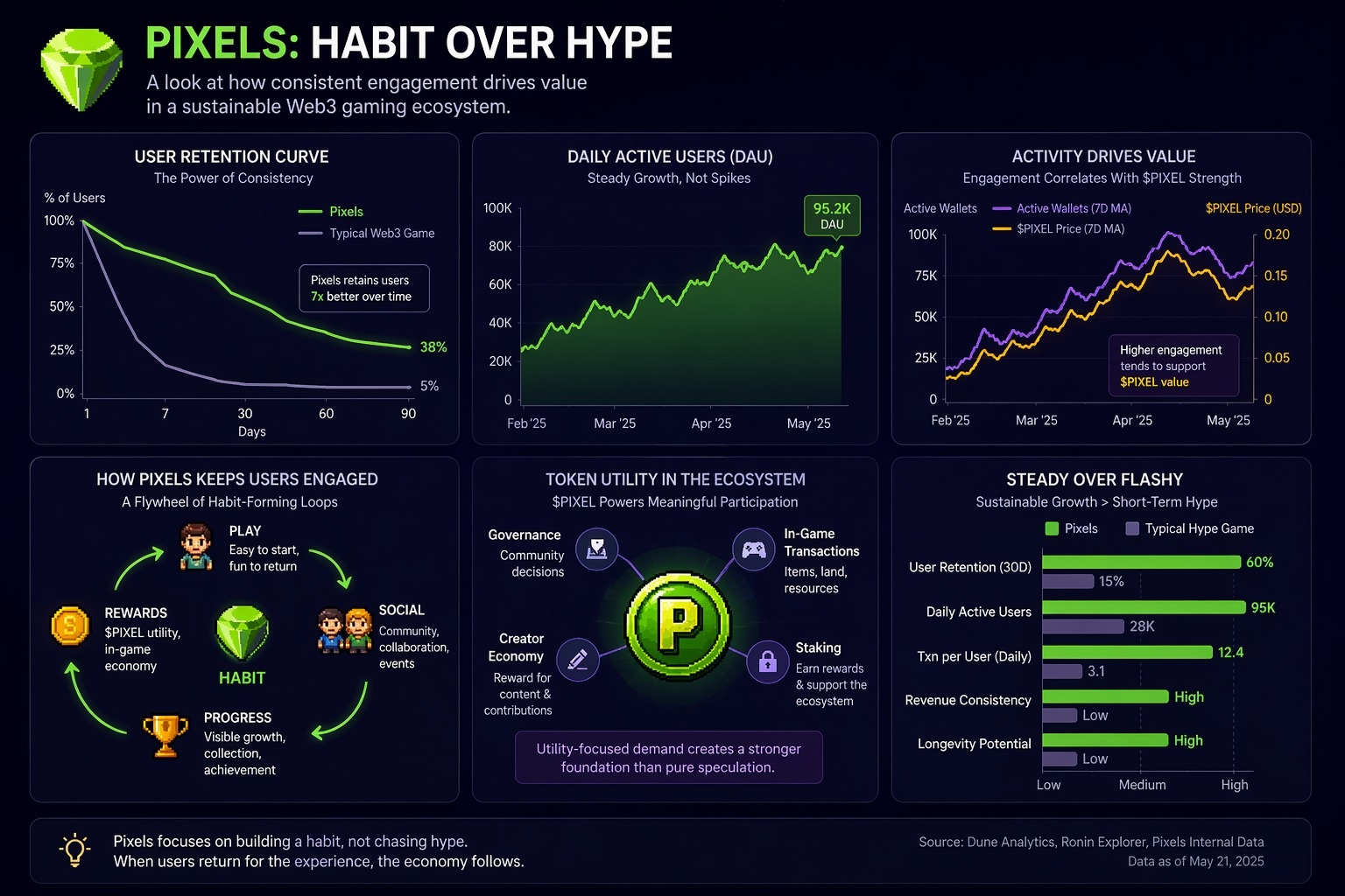 I don’t think Pixels is trying to redefine Web3 gaming in a dramatic way. If anything, it’s doing the opposite. It’s simplifying the experience and letting behavior evolve naturally. Whether that approach scales or not is still an open question. Markets don’t always reward patience, and systems built on gradual engagement often take longer to prove themselves.