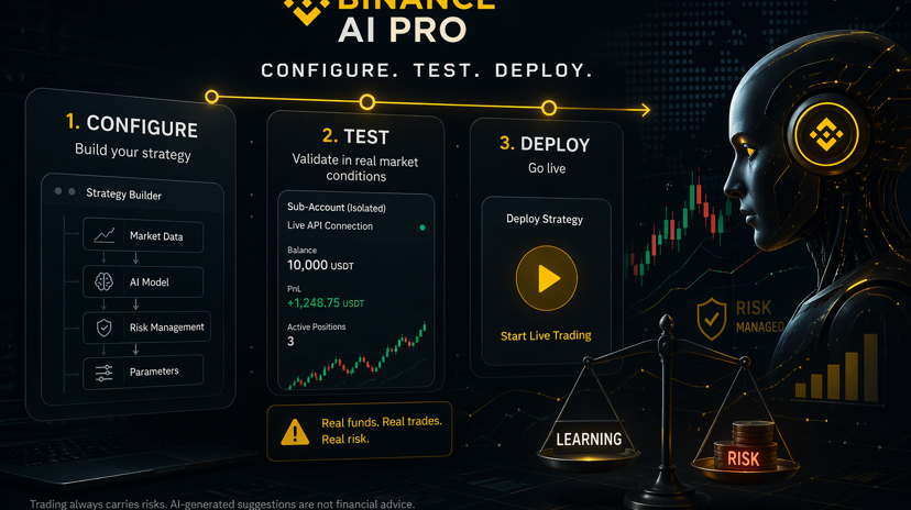 Binance AI Pro outlines its activation process in three stages: configure, test, and deploy. At first glance, that sequence feels reassuring — you design a strategy, validate it, and only then move it into production. It suggests a clear boundary between experimentation and real execution.