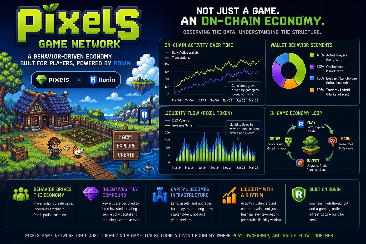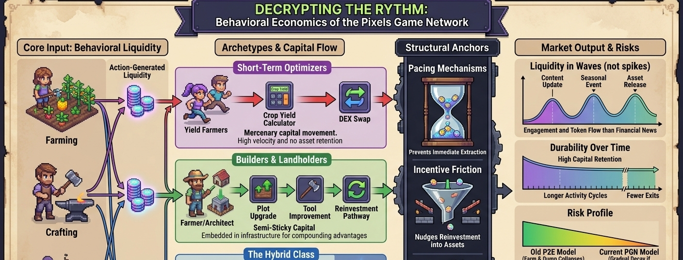 The first thing I noticed when I started tracking activity around the Pixels Game Network wasn’t raw volume or token velocityit was the rhythm. Not the kind you see in speculative ecosystems where activity spikes around listings or macro news, but something more cyclical, almost behavioral. Wallet interactions weren’t random; they clustered around ingame loopsfarming, crafting, land managementand then expanded outward into token movement. That distinction matters. It tells me immediately that liquidity here isn’t just reacting to priceit’s being generated by participation.