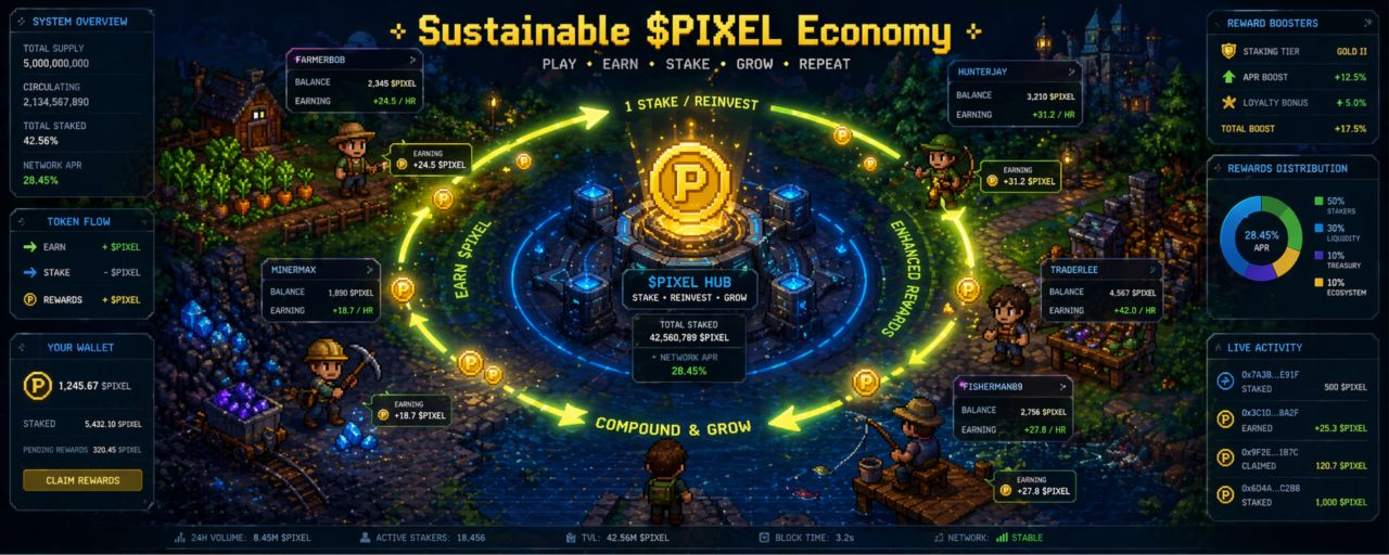 At the center of the ecosystem is PIXEL, which connects gameplay actions with economic value. Players earn tokens through farming, trading, and completing activities, but unlike traditional systems, $P$PIXEL designed to be reused within the ecosystem rather than immediately withdrawn.