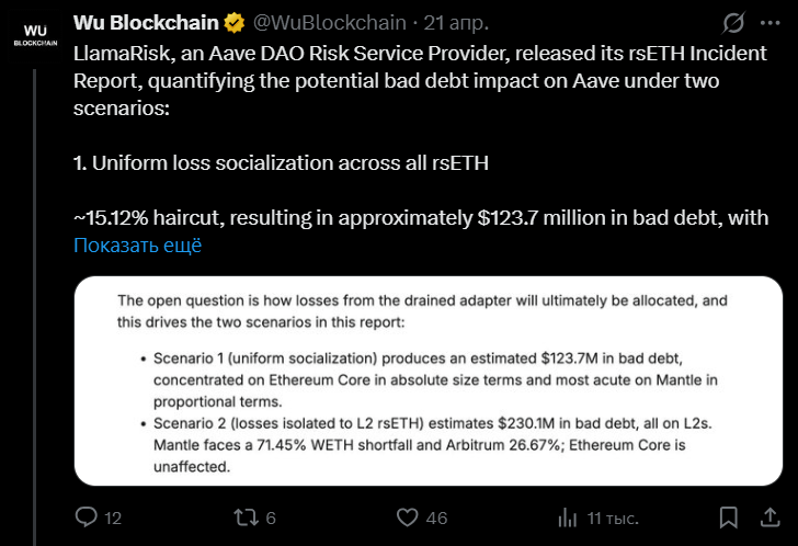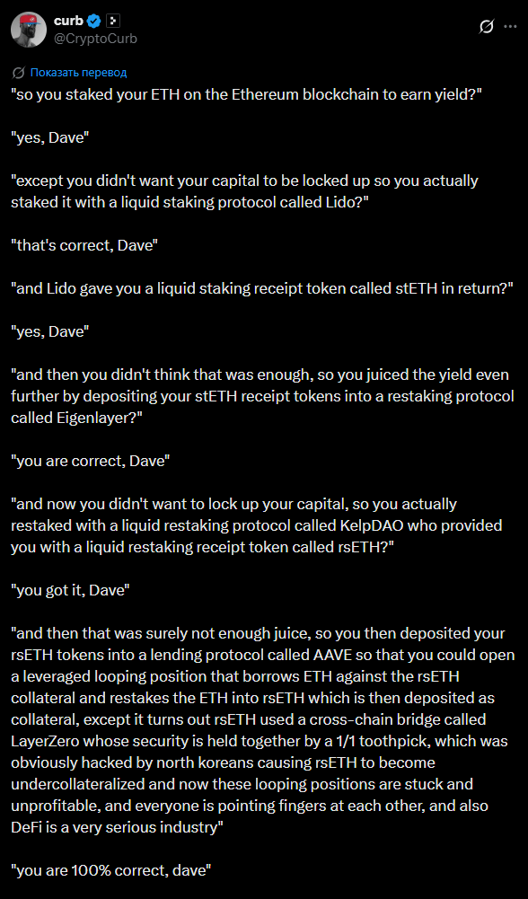 And now there is a real howl on Twitter from all the participants in the process. Aave shouts, "our smart contracts worked as they should, it was you who allowed some counterfeit crap to be printed there at Kelp!". Kelp's response is to yell, "we have nothing to do with it, we hacked the bridge using LayerZero technology!!" LayerZero makes a muzzle with a hoe and issues a press release in the style of "our technology is infallible, it's just that the handlers from Kelp couldn't set everything up properly."