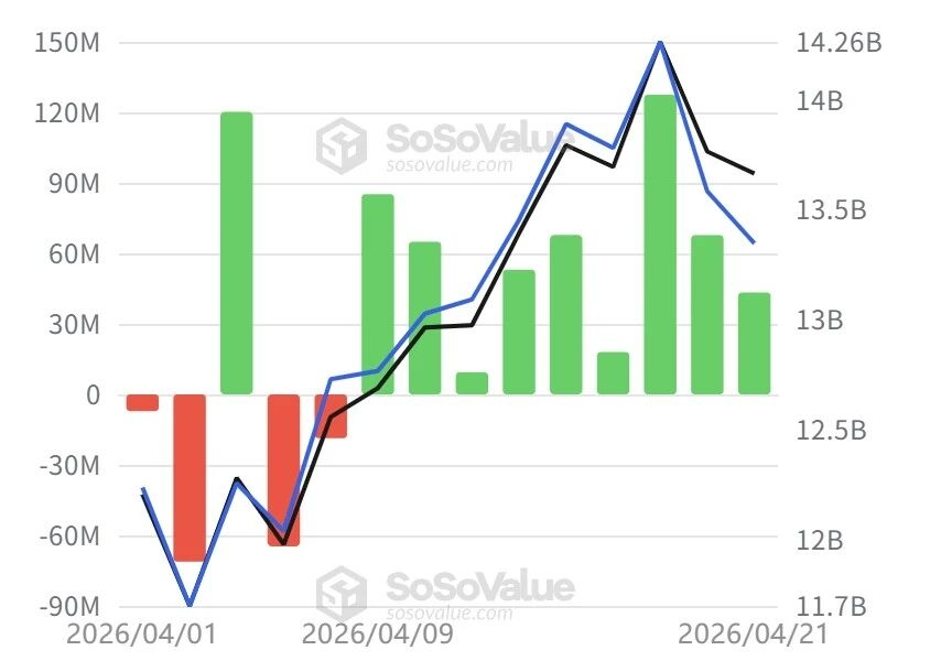 Bitcoin spot ETFs have seen a continuous net inflow for 6 days, with daily funds being positive from April 14 to 21.