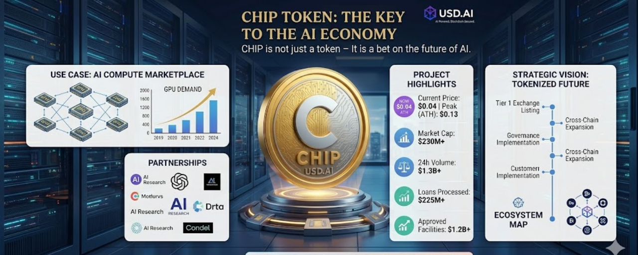 The reasons behind this explosive behavior are not random. First, CHIP rides the powerful AI narrative, one of the strongest themes in 2026. Second, it introduces a novel model—financing GPU infrastructure through blockchain—which has already processed over $225M in loans and $1.2B in approved facilities . Third, multiple exchange listings and strong community speculation have amplified liquidity and visibility