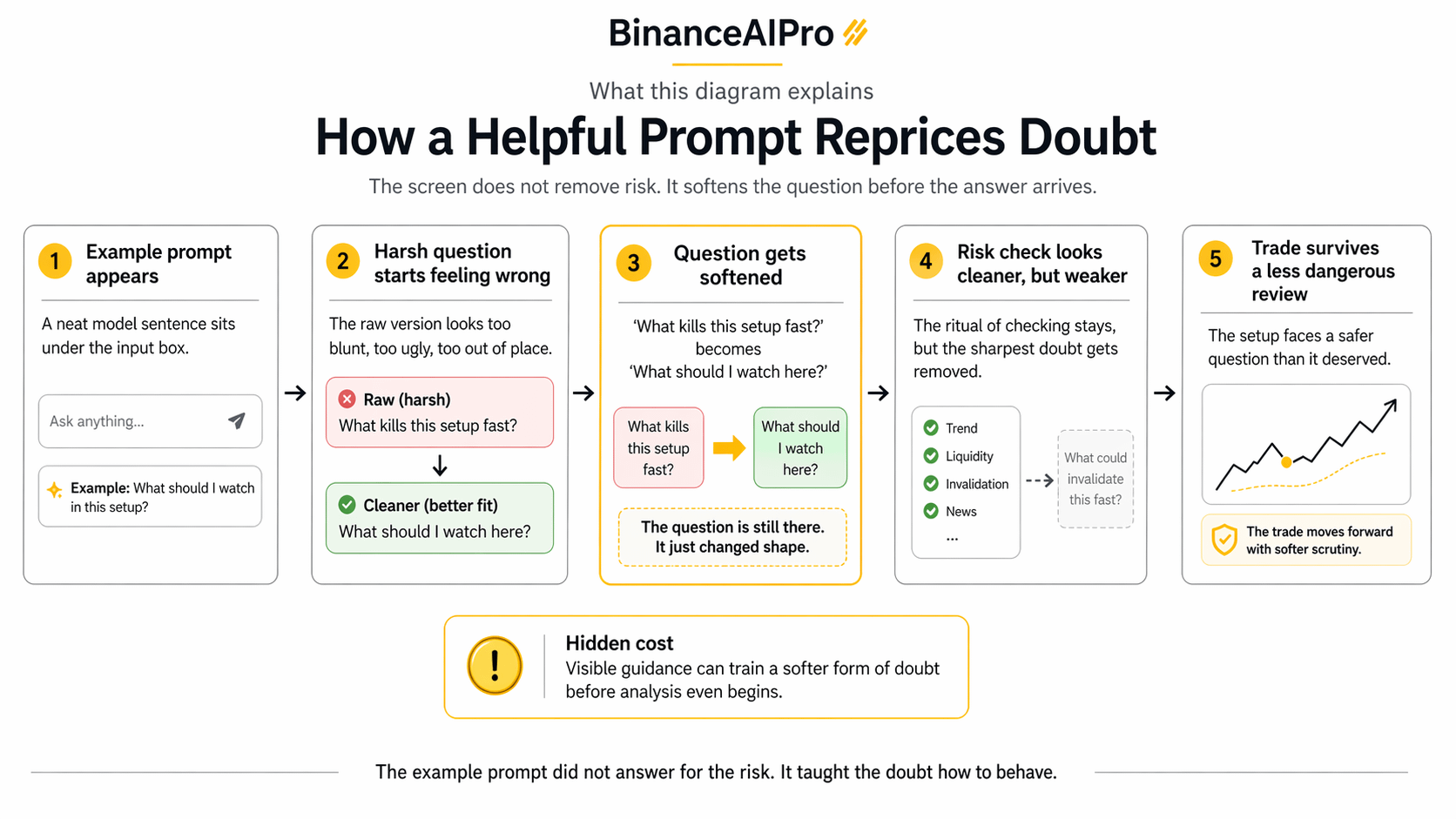 And I think the larger consequence is easy to underestimate. If enough people use BinanceAIPro this way, the product does not only influence what answers they get. It starts influencing the ambition of their doubt. They still tap another question, still sit there looking serious, still do the little ritual that lets them feel like the trade got checked. The nastiest questions are usually the first ones to get cleaned out, not because the trade beat them, but because they started looking too ugly to type into a box that was already trying to sound helpful.
