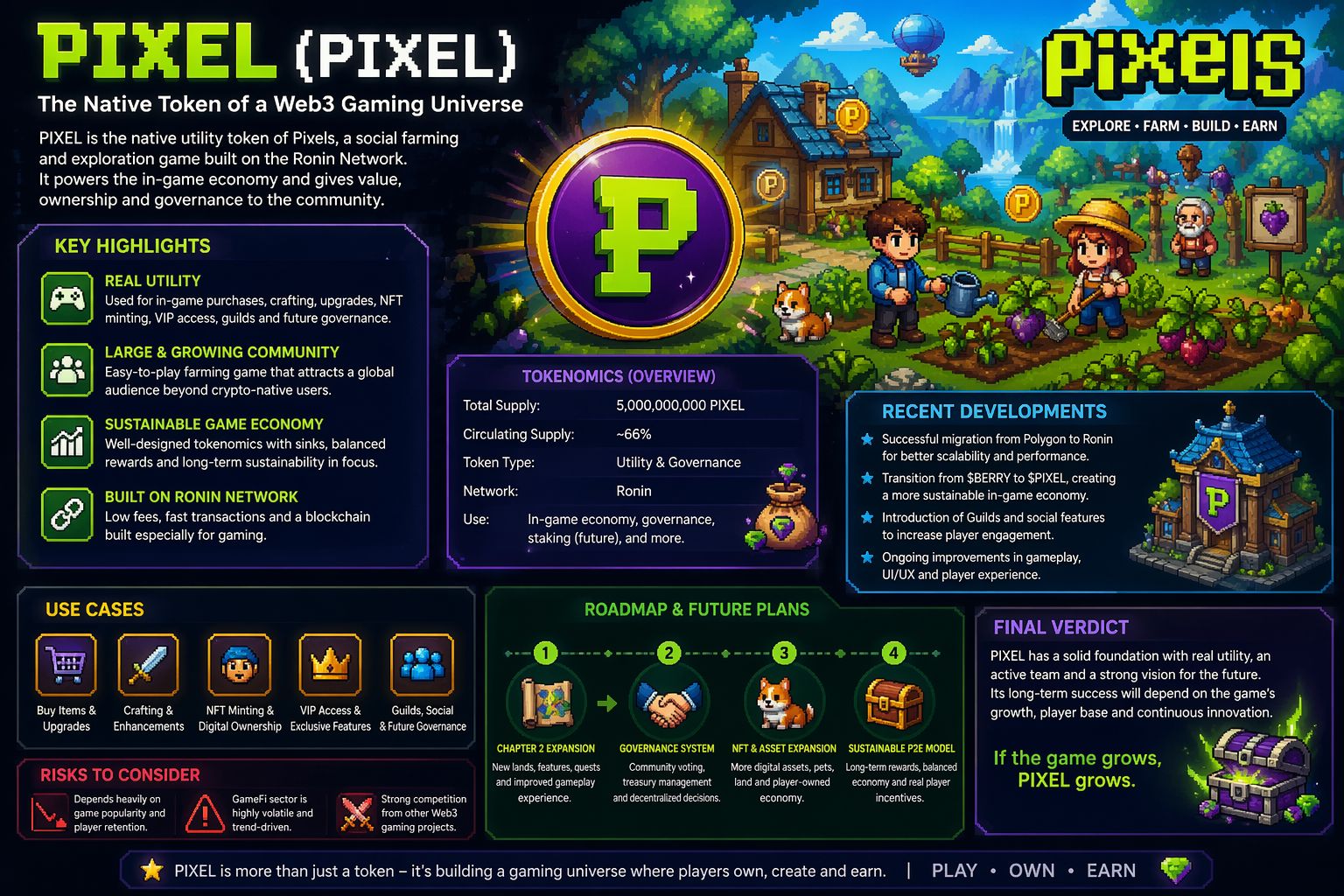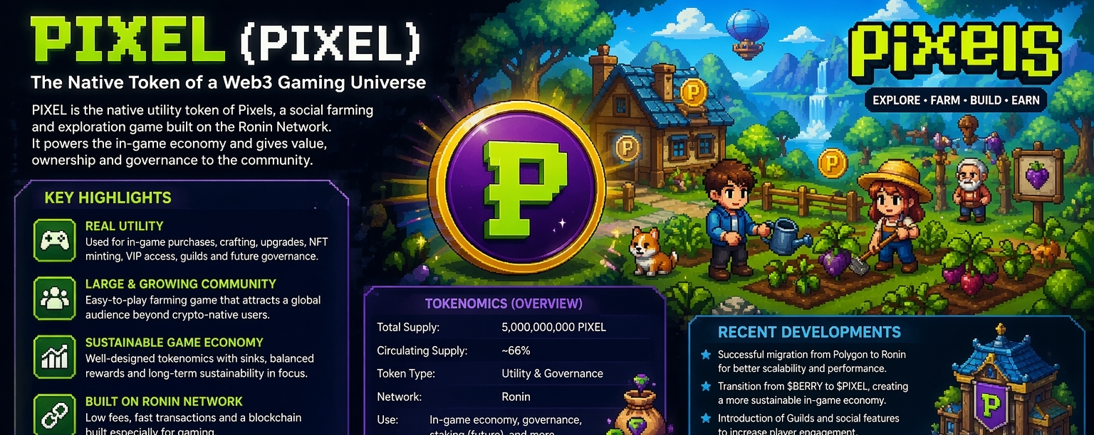 $PIXEL (@Pixels ) is not just a typical cryptocurrency—it’s the native token of a Web3 game called Pixels, a social farming and exploration game built on blockchain (mainly the Ronin network). Instead of focusing purely on speculation, the project is trying to merge gaming + digital ownership + economy into one ecosystem. (CoinMarketCap)