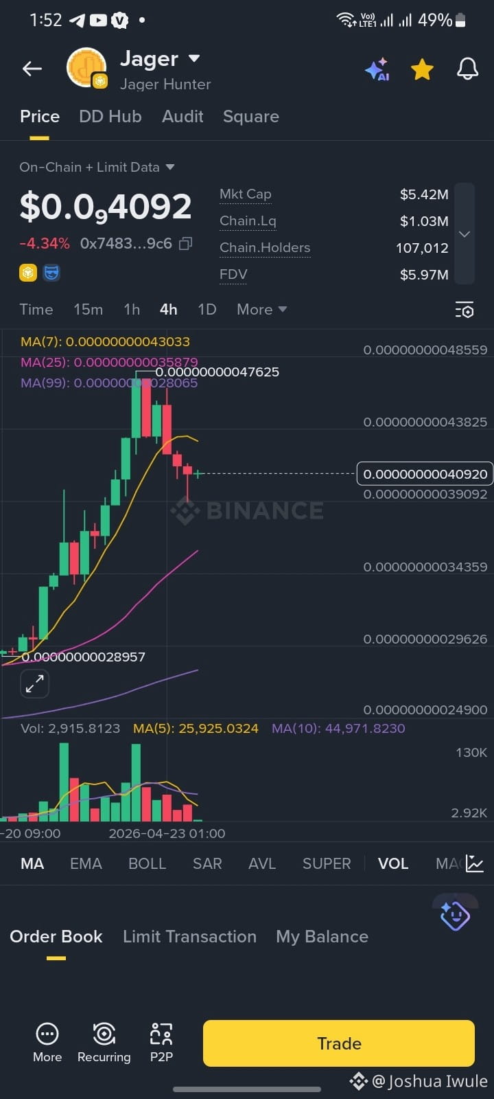 The Trend: The coin recently hit a local peak (near 0.000000000476) and is currently in a corrective phase. It is trading below the MA(7) (yellow line) and MA(25) (pink line), which suggests short-term bearish pressure.