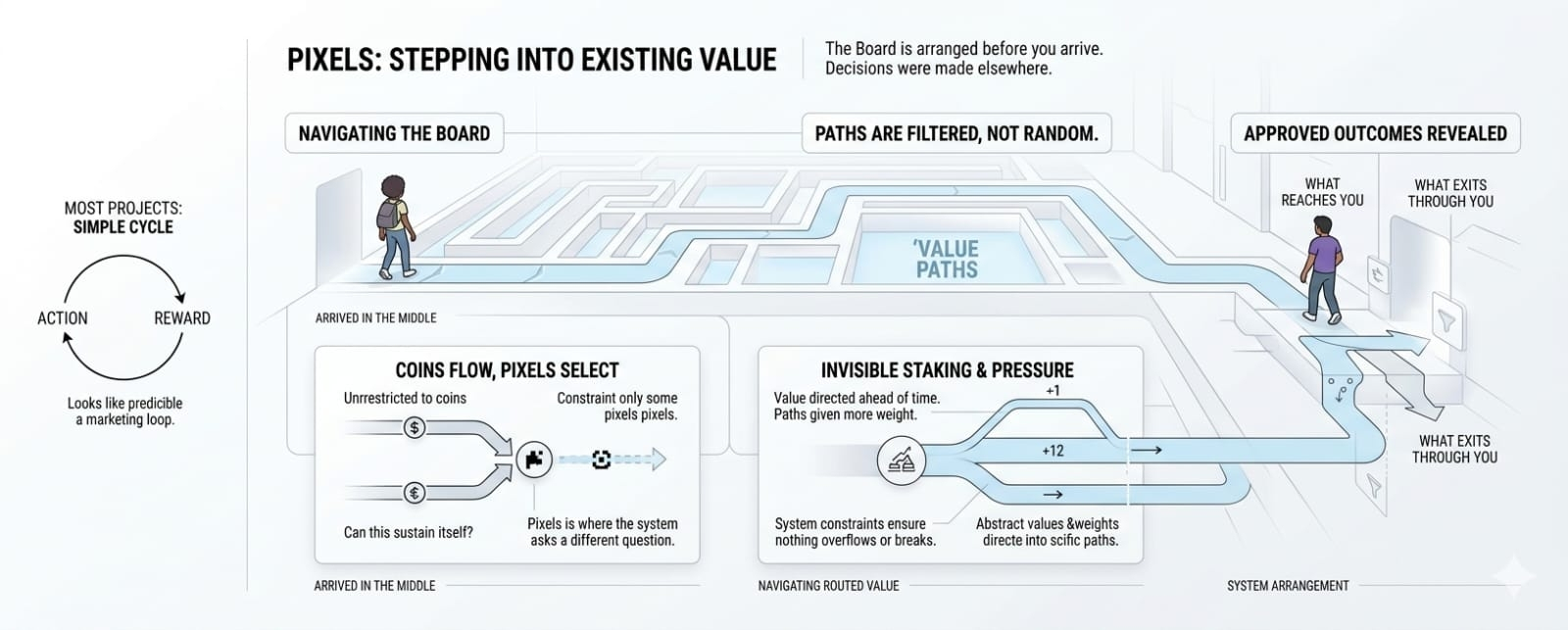 Coins don’t behave this way. They’re always there, always flowing, always available. They don’t feel restricted or shaped. But Pixels is where that changes. The moment Pixels gets involved, the system starts to feel selective. Not everything survives at that level. It’s as if the system begins asking a different question not “can this be done,” but “can this sustain itself if it is done.”