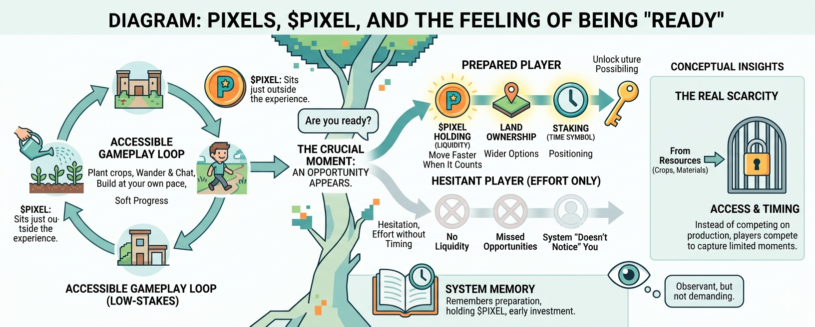 Two players might spend the same amount of time farming. One of them, though, happens to be holding some $PIXEL, or already owns land, or has been staking for a while. When a valuable opportunity shows up—something limited, something that actually changes their position—that player can act immediately.
