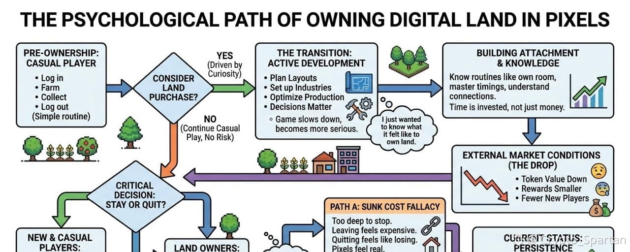 I know what this is. Ive read enough about psychology to know its the sunk cost thing. You keep going not because the future looks good but because youve already put in so much that quitting feels worse than continuing. Even when the smart move might actually be to stop. Pixels does this really well whether they planned it or not. The game never forces you to buy land. It always says its optional and technically thats true. You can play the whole game without owning anything. But if you stick around long enough you start feeling like land is just the next natural step. Like thats where things get real. And once you cross that line you stop being a casual player and you become someone who has a thing to take care of.
