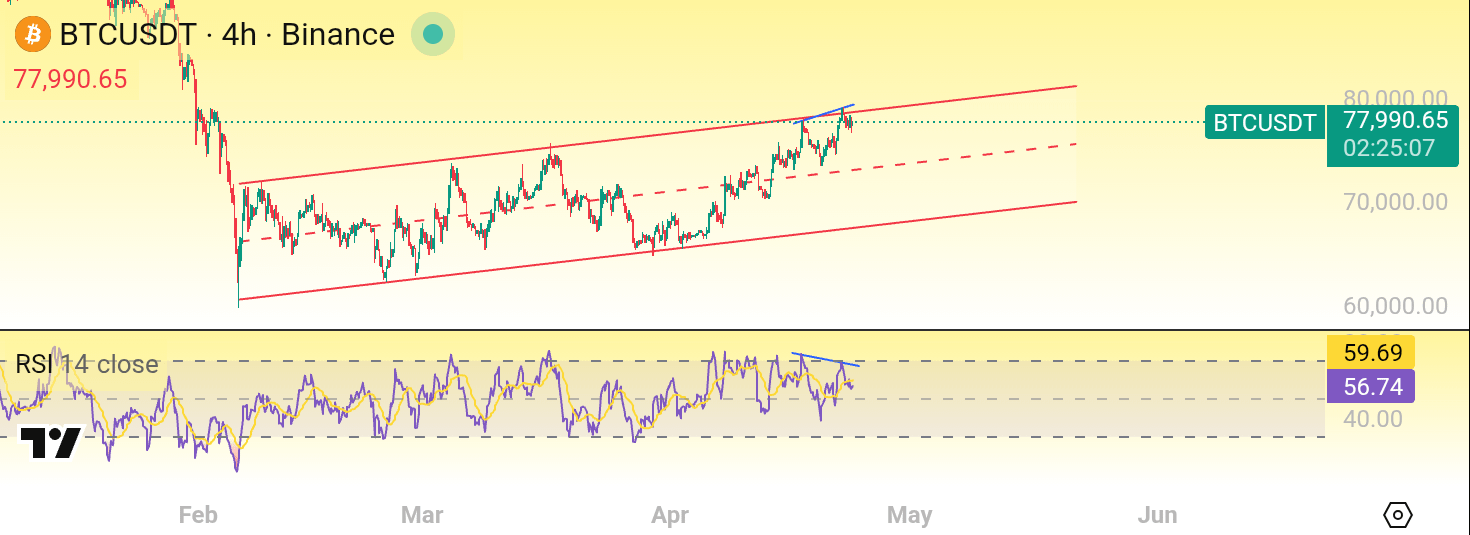 As you can see on the 4-hour chart, Bitcoin is forming a bearish RSI divergence. While the price is making higher highs, the RSI is forming lower highsโthis is a classic bearish signal.