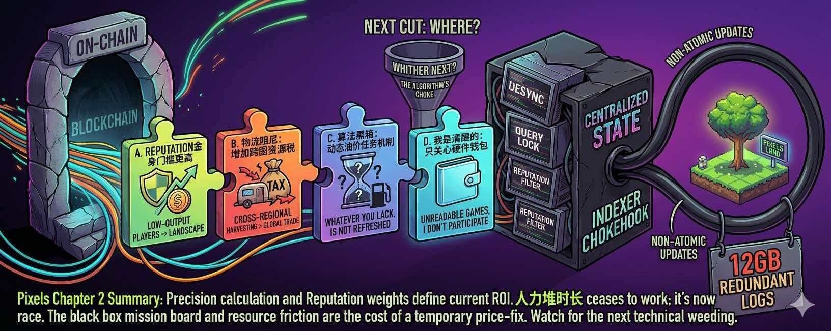 Chapter 1阶段,项目为快速扩张仓促开发,积累大量技术债:底层架构碎片化,生产技能、道具配方冗余繁杂,链上资产与游戏数据割裂;同时产出机制无约束,脚本刷金、多号挖矿泛滥,各类资源无限增发。叠加早期重产出、弱销毁的经济设计,供需彻底倒挂,资产持续贬值,形成死亡螺旋。海量闲置存量积压场内,投机资金主导流动性,真实游玩需求被挤压,生态循环濒临失效。$PIXEL
