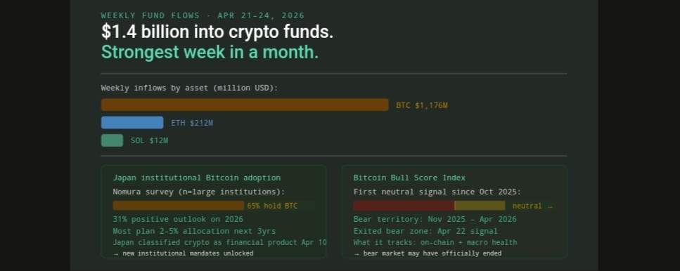 $1.4 billion into global crypto funds — strongest week in a month.